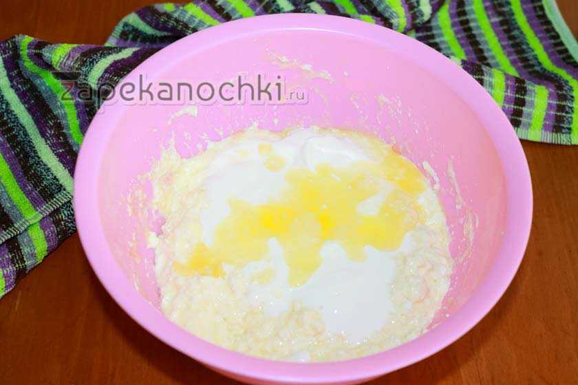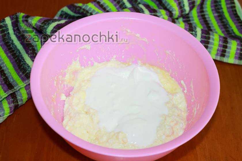 4. Соедините сахар, и желтки с творожком. Перемешайте. Далее добавьте сметану и крахмал с ванилью.