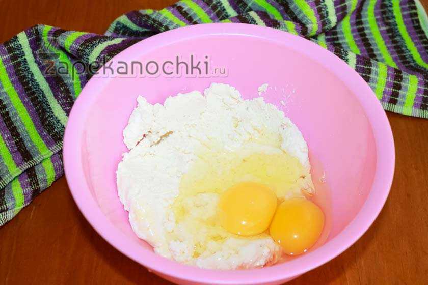 3. Разминаем творожок вилкой. Добавляем к нему яйца.