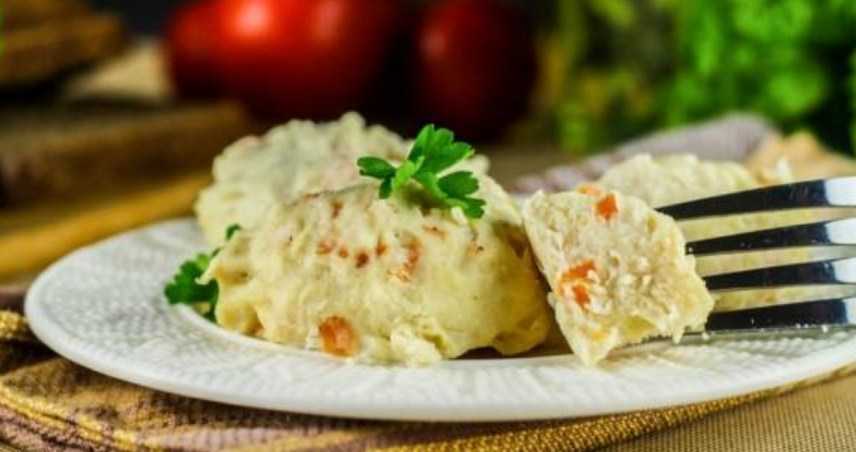 - Обжаренное филе соединяют с кусочками плода и перекладывают в форму для выпечки. В блюдо добавляют рубленый чеснок и сметану. Все компоненты старательно перемешивают. Форму накрывают фольгой.