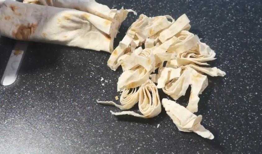 Лаваш свернуть вдоль рулетом, нашинковать тонкими полосками поперек «улитки». Сыр натереть на овощной шинковке.