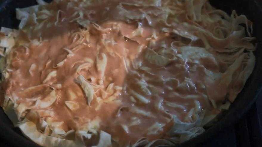 Смазать маслом сковороду при помощи кулинарной кисточки. Выложить лаваш тонким слоем, залить яичной смесью и кетчупом, соединенным с майонезом.