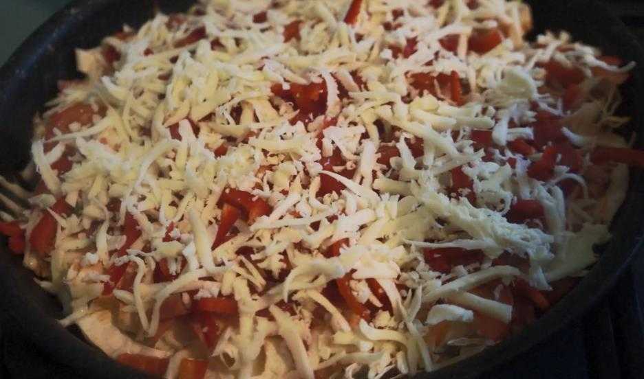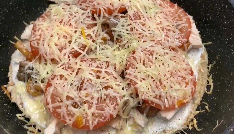 - Обильно смазать поверхность сливочным соусом, распределить в любом порядке курятину. На них отправить грибы в любом количестве, разложить помидоры. Притрусить сырной стружкой, подержать на среднем огне 5-7 минут, накрыв крышкой.
