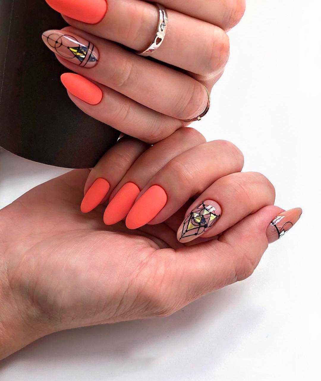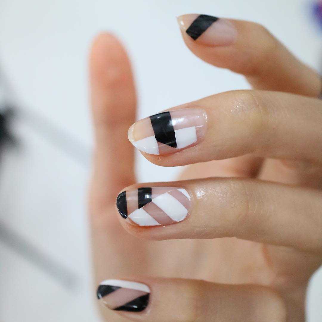 - Прозрачный фон, геометрия Короткие ногти можно украсить черными геометрическими принтами с четкими острыми углами. Технически это несложно, а выглядит оригинально. Такой нейл-арт подходит также для вечернего выхода.