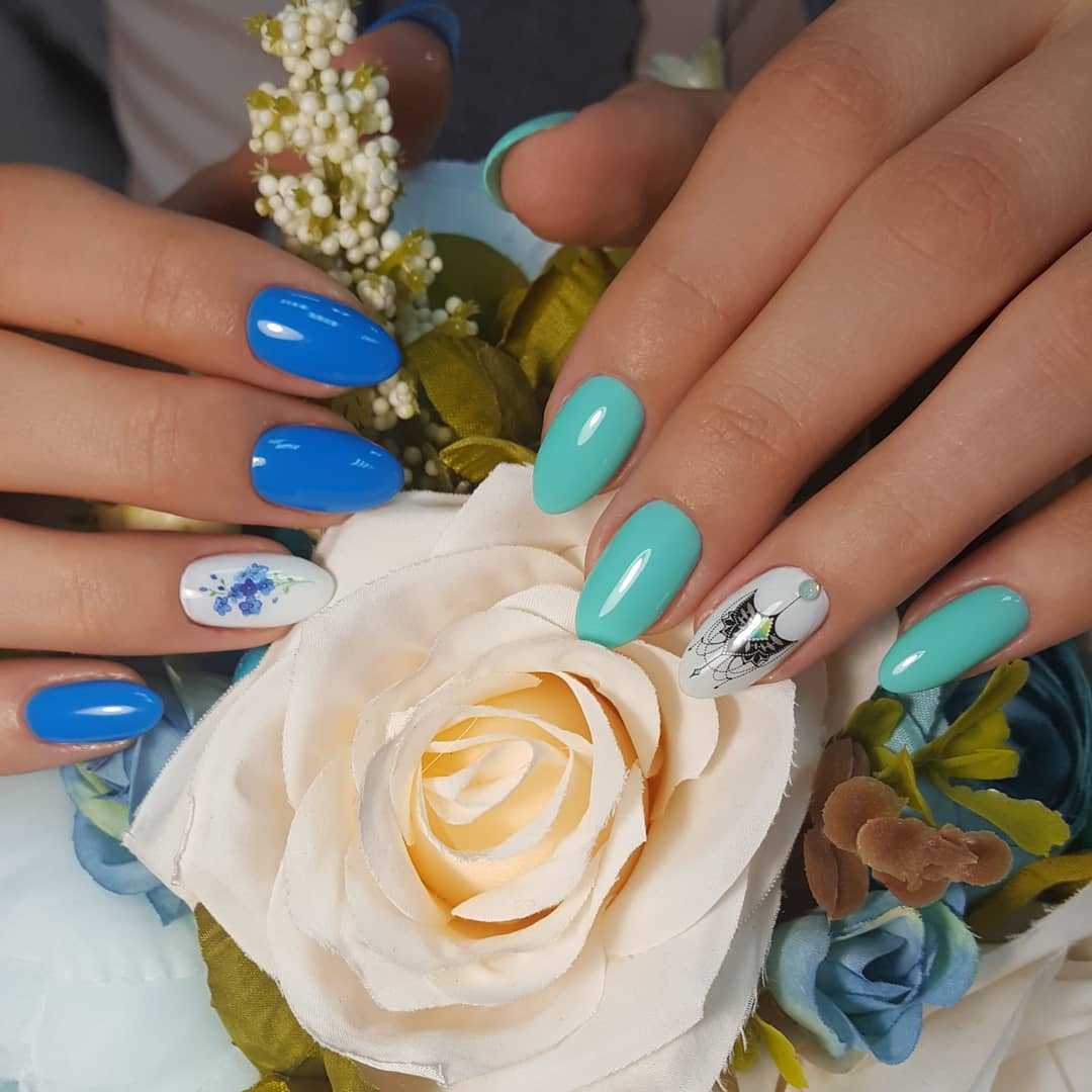- Светло-голубой + узоры растений Дизайн получается яркий, но не броский, свежий, спокойный.