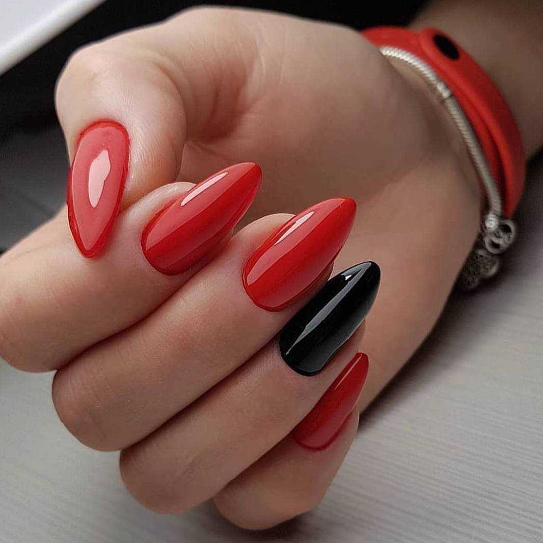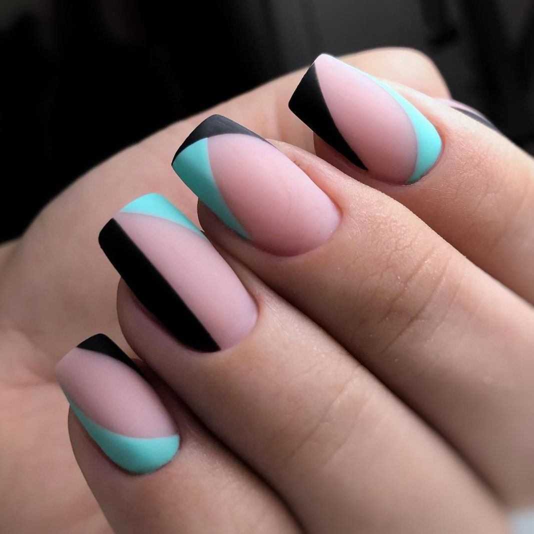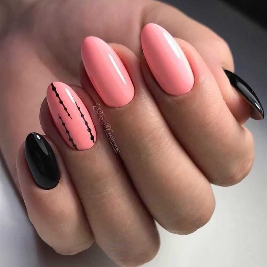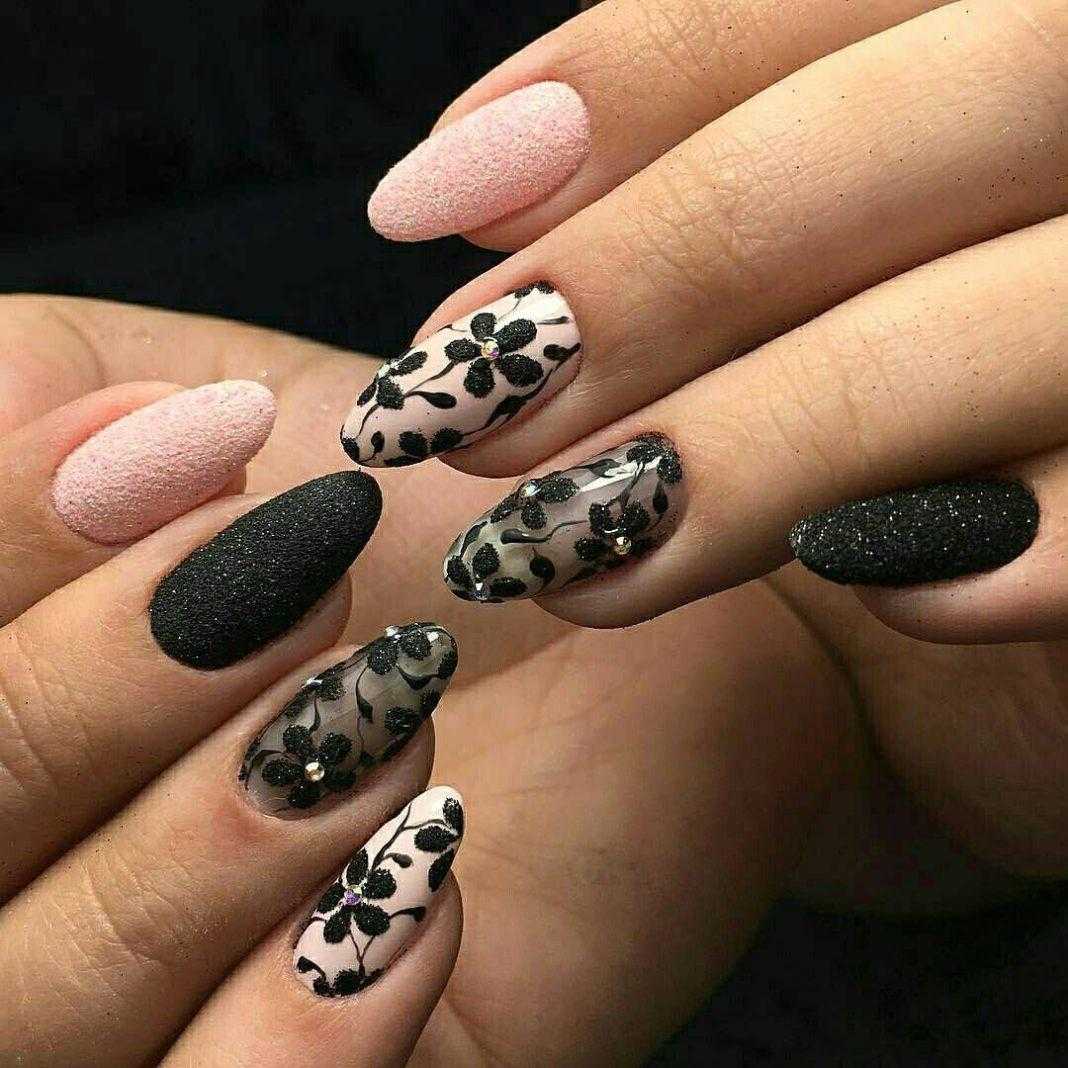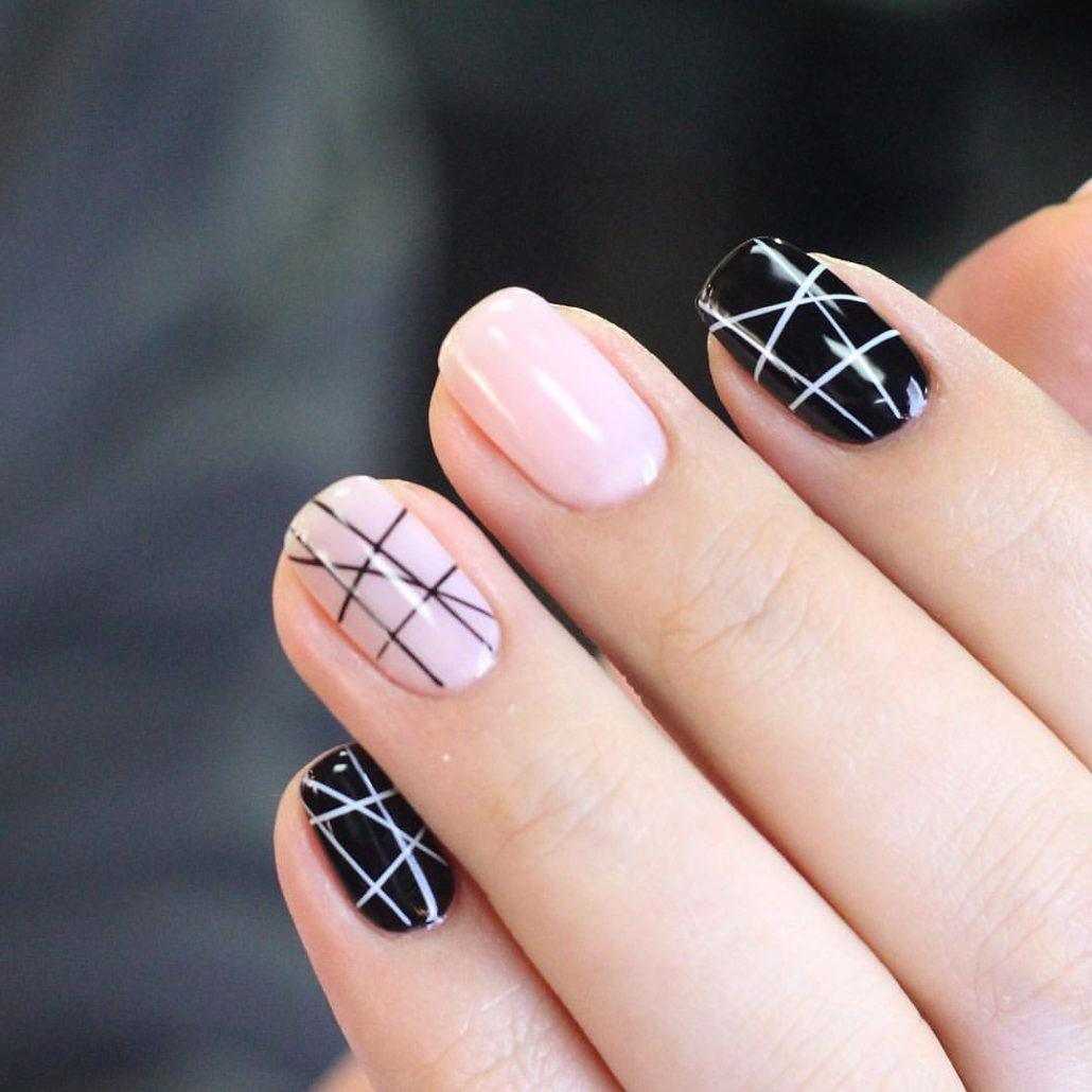 Черный маникюр отлично сочетается с белым, бежевым, металликом разных оттенков (фольга, «битое стекло»), персиковым и нежно-розовым.