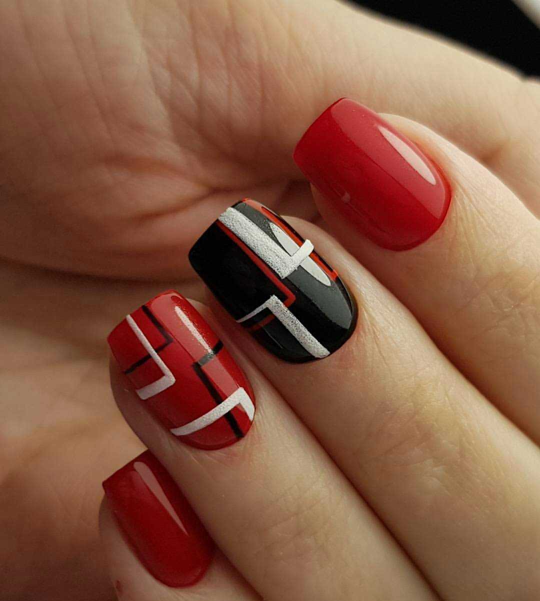 Строгие линии геометрического маникюра как нельзя лучше сочетаются с черно-белой цветовой палитрой. Тонкие черные полосы на белом фоне, геометрические узоры в виде шашечной доски, ирландская пряжа, хаотичное нагромождение геометрических фигур выглядят органично.