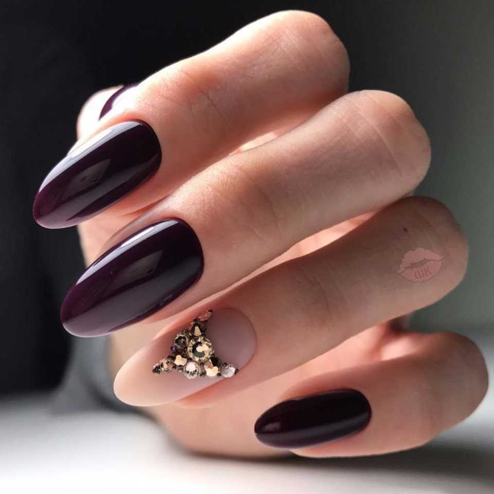 - Возможность создавать оригинальные дизайны Иногда на матовую основу наносят рисунки глянцевым лаком, блестками, стразами. Такое решение выигрывает благодаря контрасту. На бархатном лаке легко рисовать, узоры не растекаются.