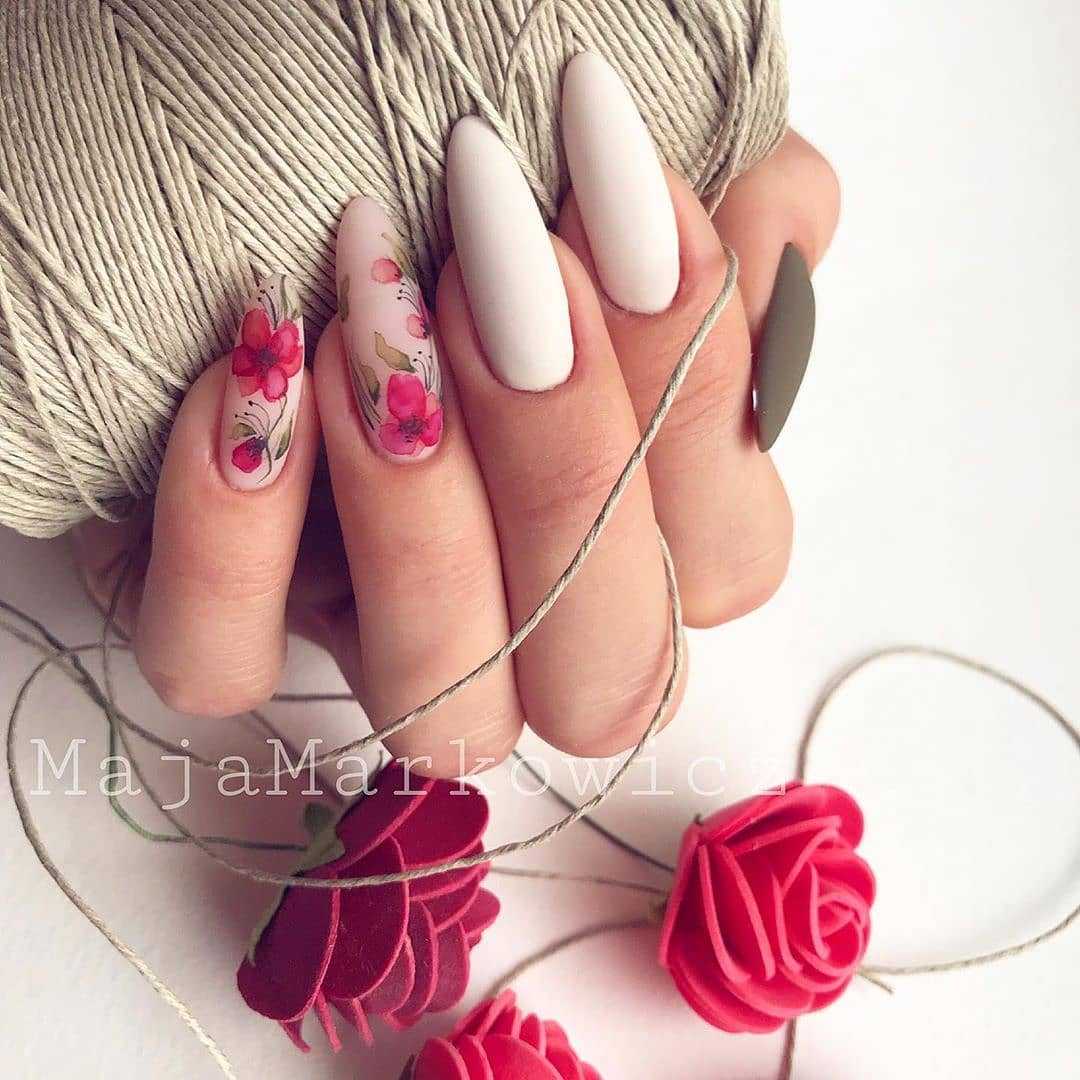 Белый маникюр 2019 года с росписью предполагает изображение на ногтях крупных рисунков, геометрических узоров и орнаментов. Это могут быть как цветы и фрукты, так и китайская или восточная роспись.
