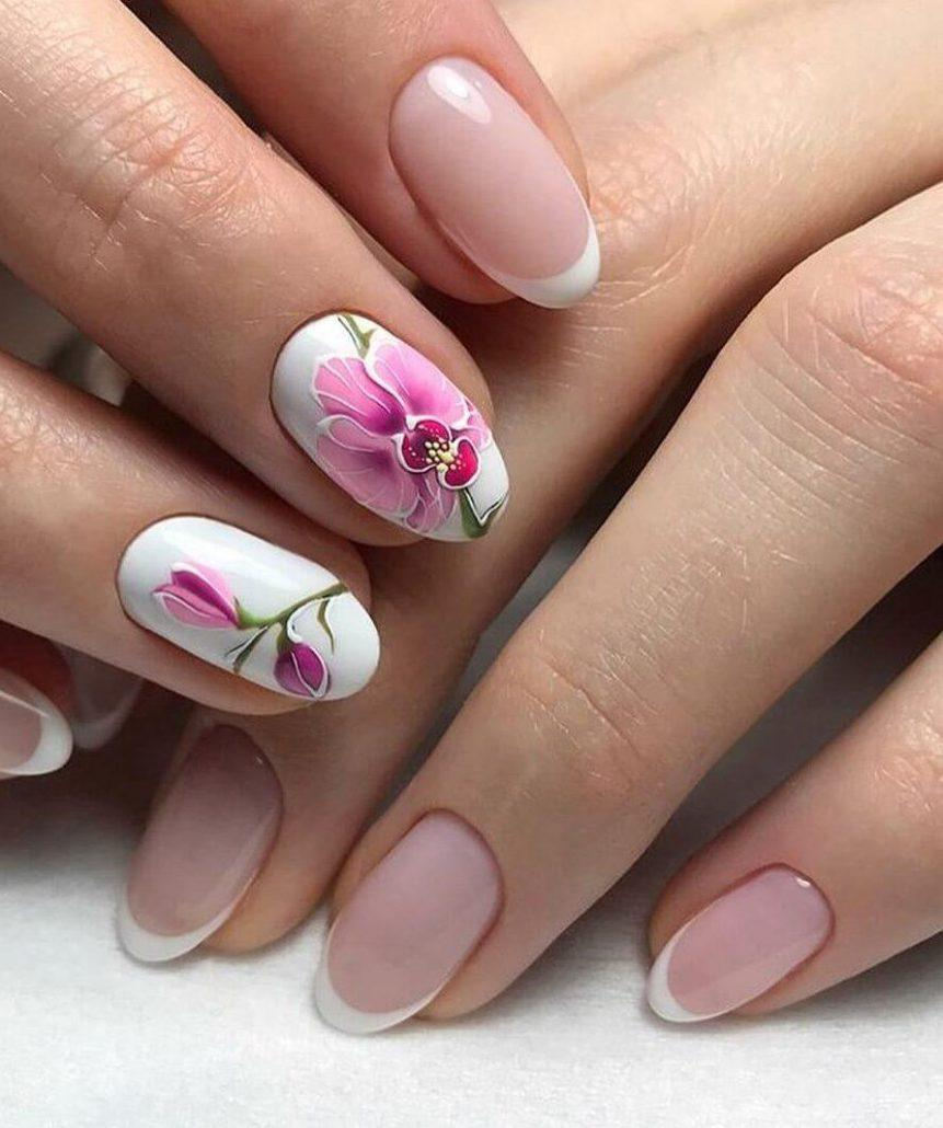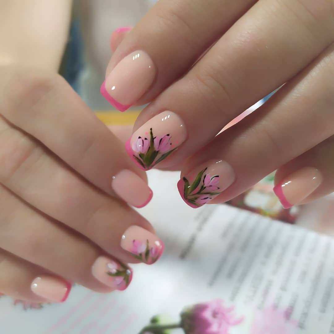 Красивый дизайн можно создать при помощи рисунков цветов. Такой френч выглядит женственно и нежно. Его из года в год выбирают женщины всех возрастов и статусов. Лето 2022 года не может пройти без такого оформления ногтей.