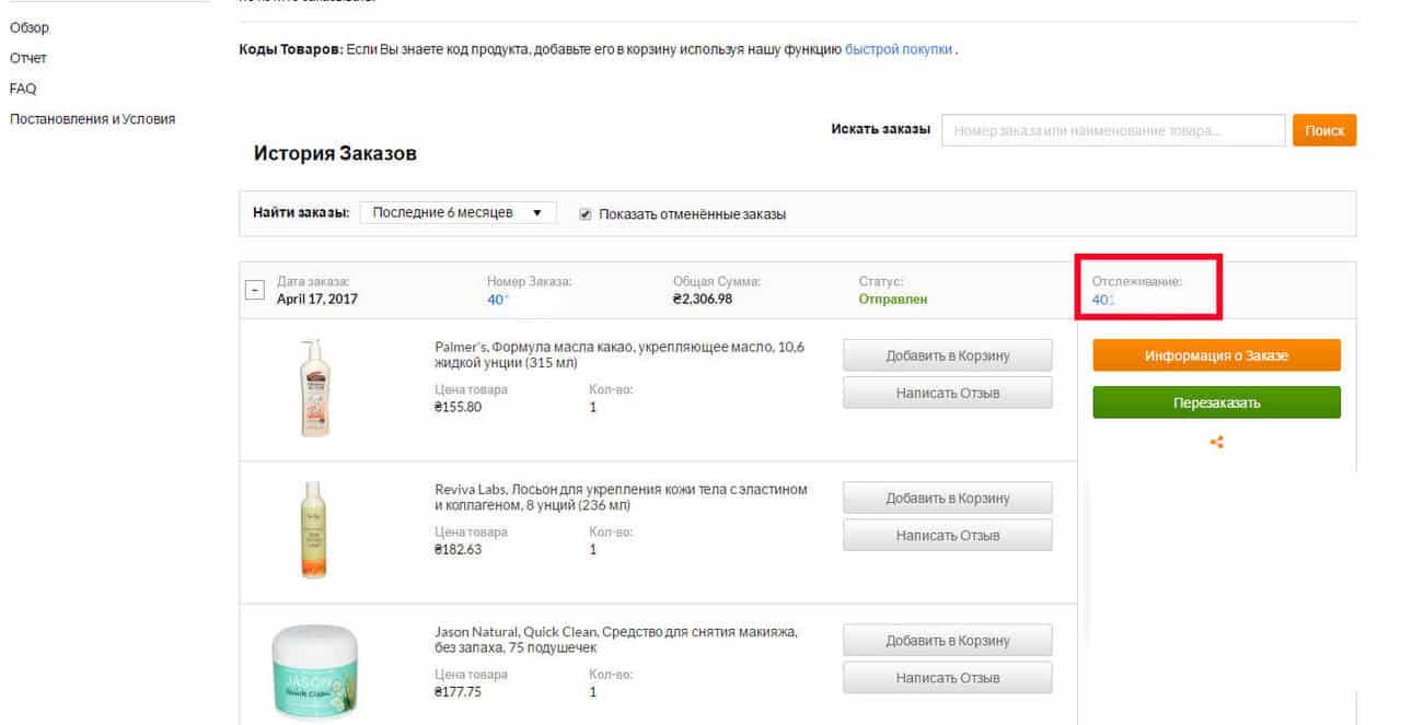 Далее ищем раздел «История заказов», и жмем на строку «Отслеживание». Открывается страница службы доставки, в которой периодически обновляется информации о том, где находится ваша посылка. Поскольку индивидуальный номер присваивается абсолютно каждой посылке, потерять ее практически невозможно. Но по любым вопросам вы всегда сможете обратиться в службу поддержки.