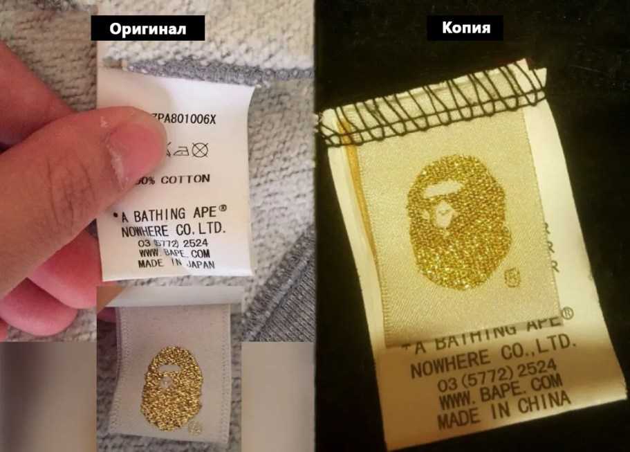 При осмотре бирок, ярлыков и надписей, имеющихся на футболках, оценивают качество шрифта и его четкость. На подделке текст бывает размытым с пробелами, толщина линий разная и т.д.