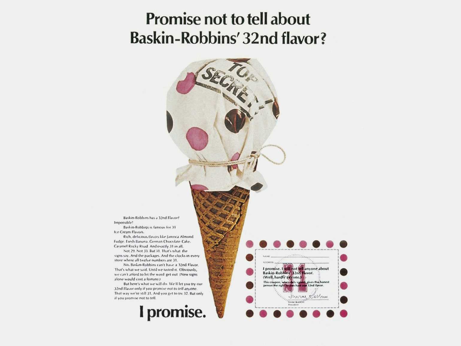 Реклама мороженого Baskin Robbins семидесятых в упаковке с розовым и коричневым горошкомИзображение: Baskin Robbins / Communication Arts