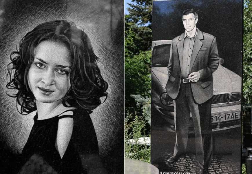 - черно-белые изображения: картинки такого типа более просты в реализации, чаще всего выполняются с использованием техники фотокерамики, итоговый результат обычно соответствует внешнему виду умершего, но изготавливается такое изображение отдельно от памятника, на последнем этапе крепится на камне.
