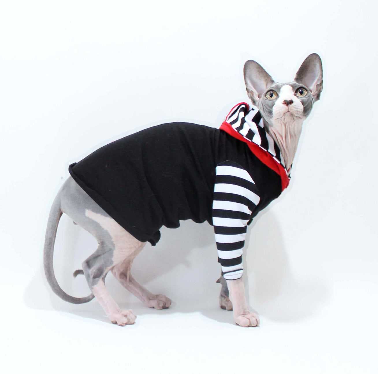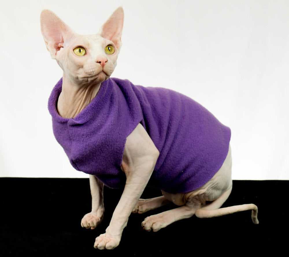 - Плюшевая толстовка – одежда для лысых кошек и короткошерстных пород: петерболды, бамбины, корниш-рексы, британцы. Впитывает влагу, хорошо согревает тело, не выгорает под воздействием ультрафиолетовых лучей, переносит многочисленную стирку и не линяет;