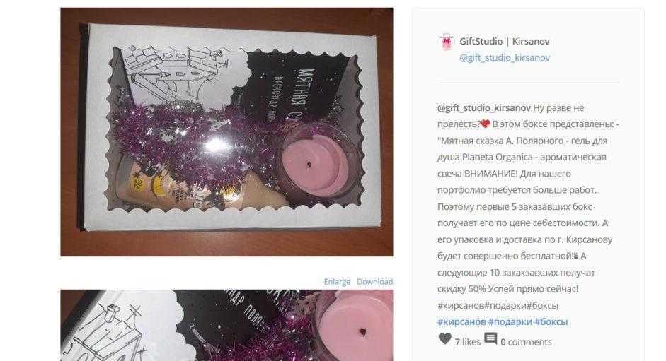 Мы не закупались товарами заранее. Ведь боксы планировалось производить на заказ. Но примеры работ всё же необходимо было выложить.