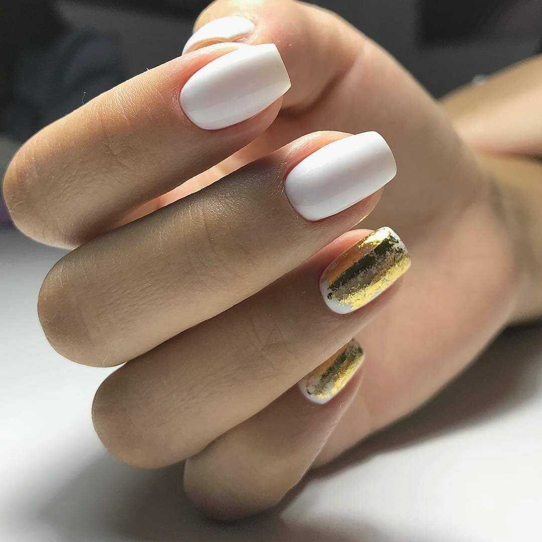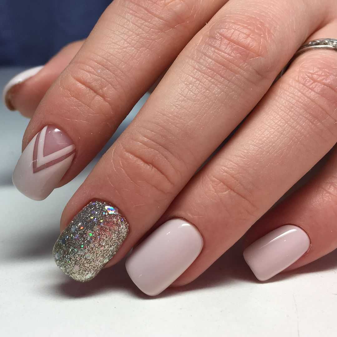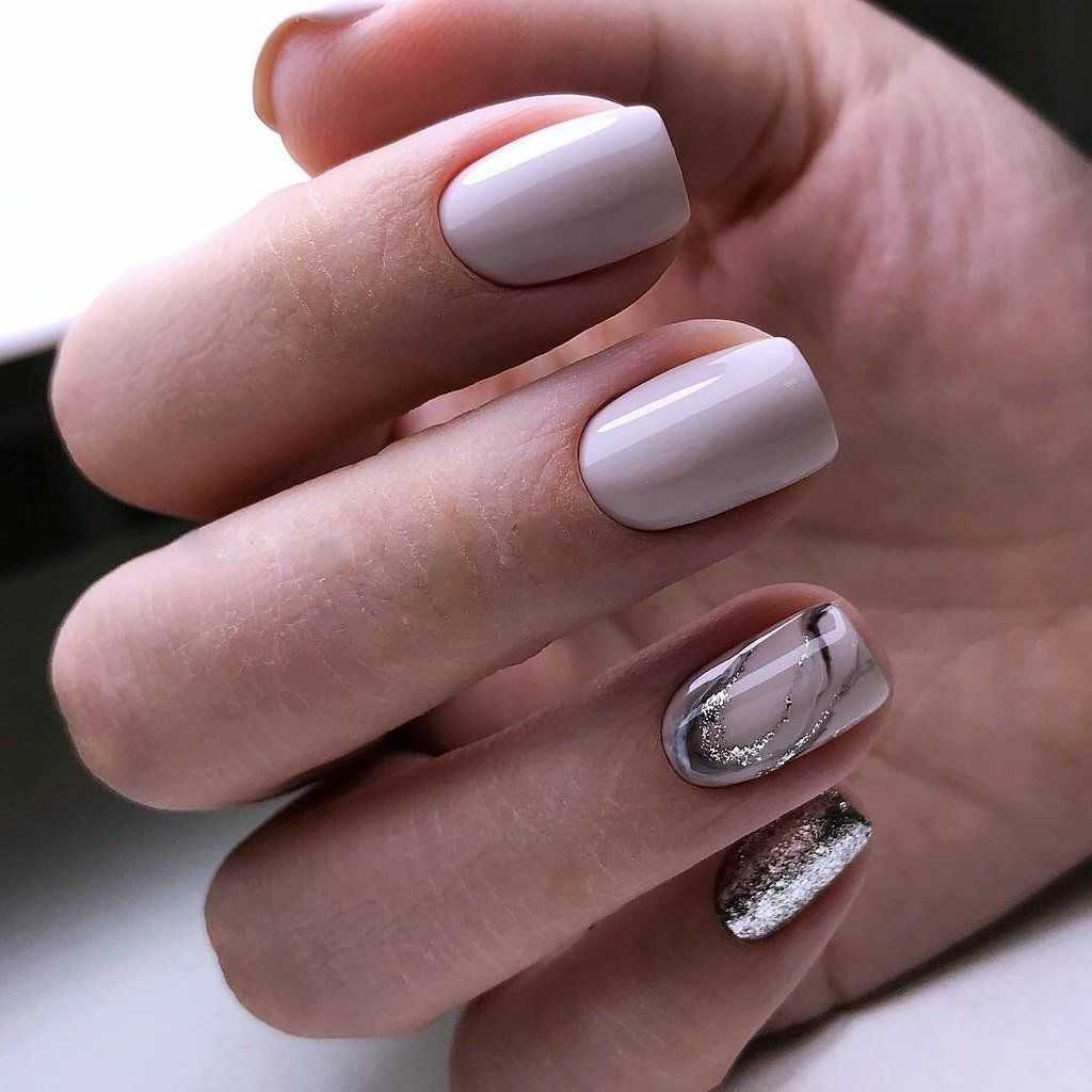 Вы точно не прогадаете, если решите сделать дизайн в неувядающей классике – бежевых, нюдовых и молочных тонах. Только рекомендуется делать ставку на стильное глянцевое покрытие. Усилить эффектность и антивозрастное действие можно с помощью втирки или блесток.