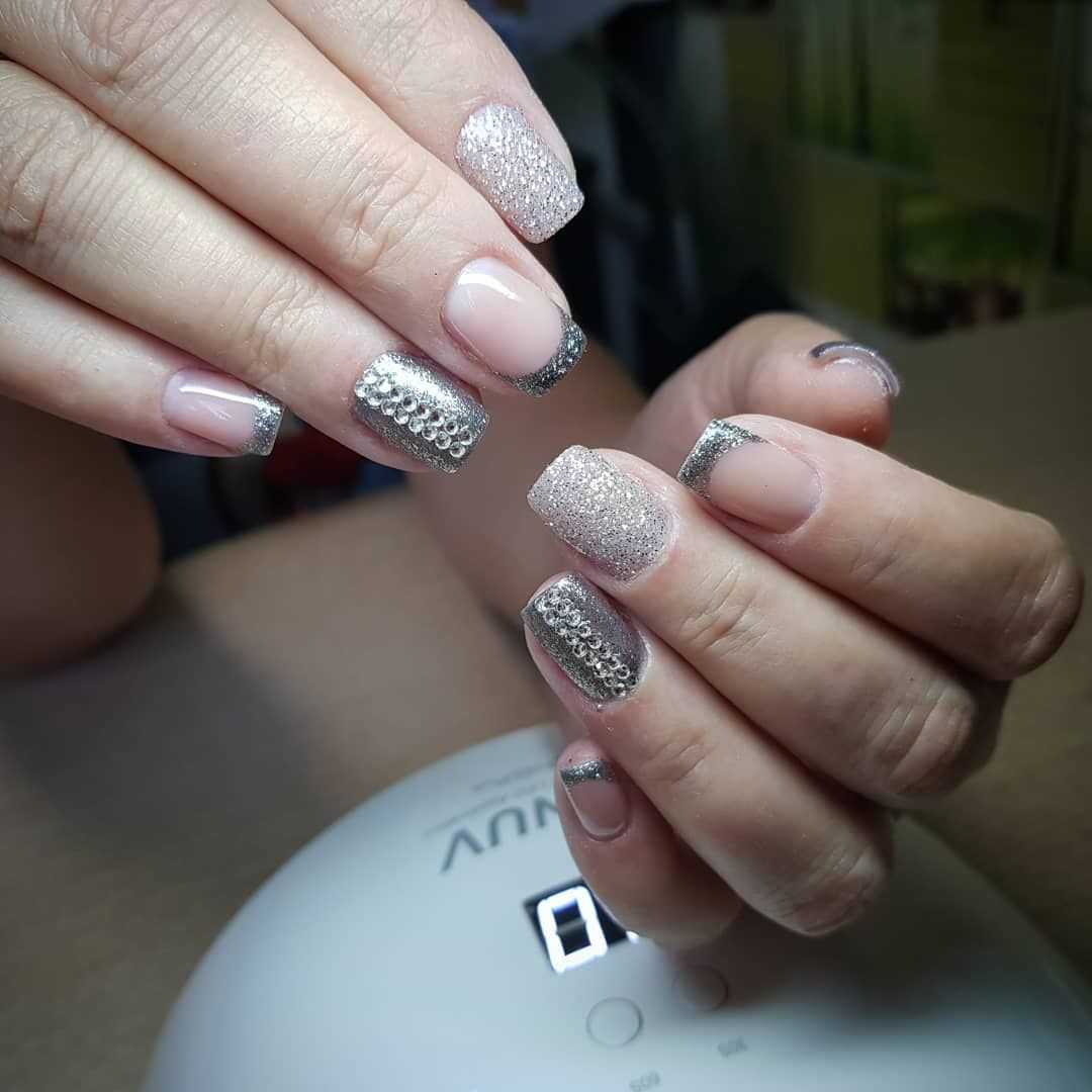Антивозрастной френч будет изящно смотреться не только с белой улыбкой, но и с окантовкой в виде фольги или блесток. Сверкающий дизайн сделает кожу рук более молодой, подчеркнет ухоженность дамы, а также будет смотреться дорого и роскошно.