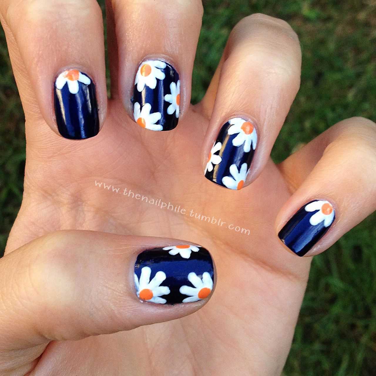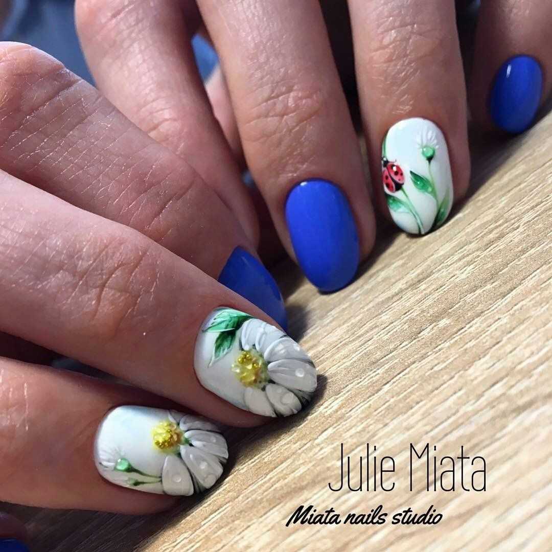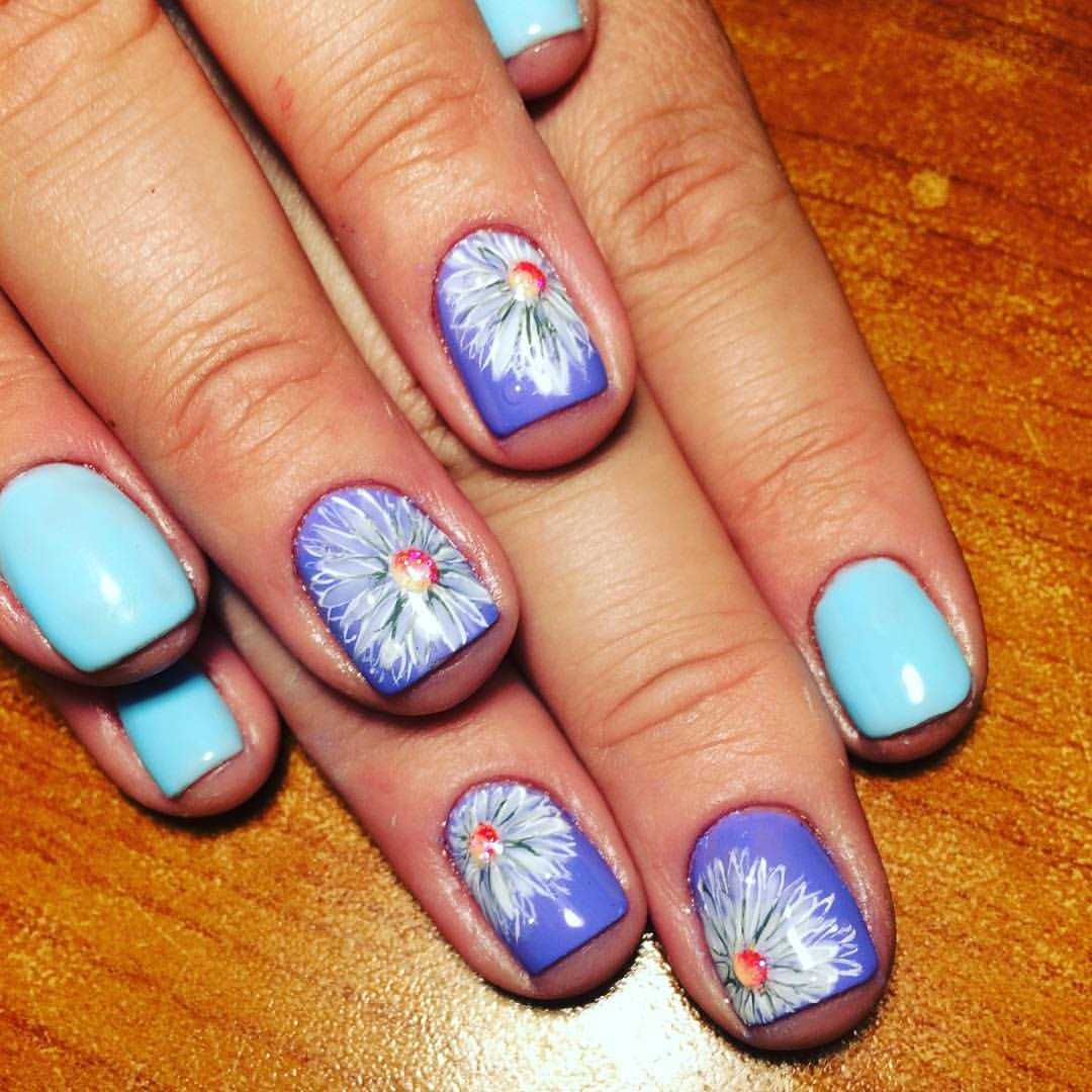 Кроме того нужно с осторожностью отнестись к количеству цветочков. Оптимальный вариант – это акцентировать 1-2 пальца узорами с ромашками, а остальные покрыть однотонным лаком
