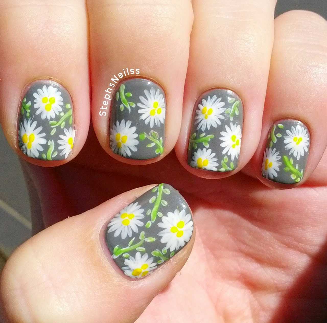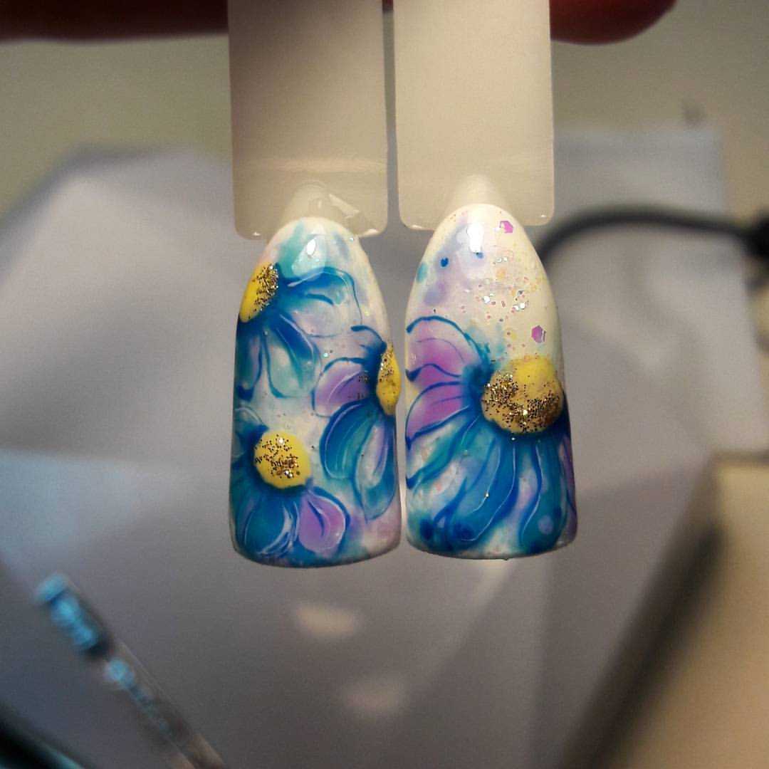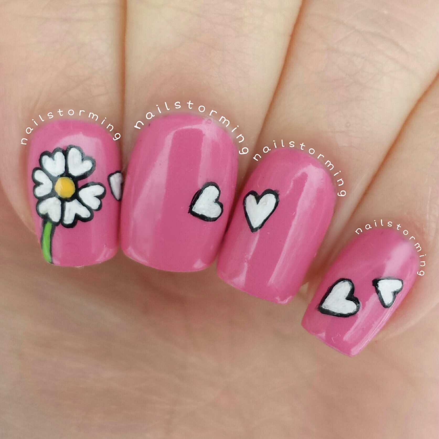 Кроме того нужно с осторожностью отнестись к количеству цветочков. Оптимальный вариант – это акцентировать 1-2 пальца узорами с ромашками, а остальные покрыть однотонным лаком