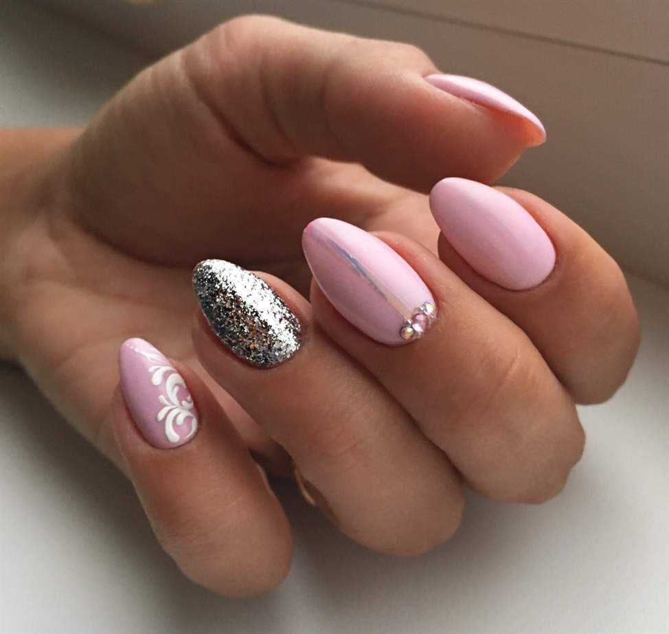 Розовый цвет лояльно относится абсолютно к любому декору. Это могут быть строгие геометрические формы, легкие летние узоры с фруктами, цветами. Все эти узоры можно дополнить гель-лаками с глиттером или окрасить 1-2 ноготка на руке сплошным слоем глиттера.