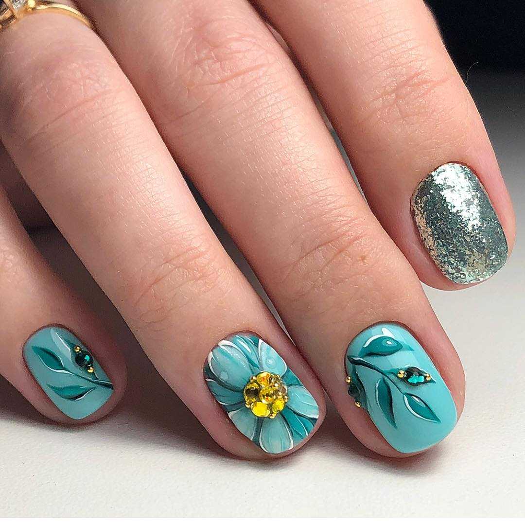 Выигрышные оттенки лаков можно найти в мятной, бирюзовой или светло-голубой палитре. Такие тона прекрасно сочетаются с тонкой светлой кожей, освежают и облагораживают образ. Голубая палитра удачно комбинируется с утонченными рисунками, стразами, блестками и втиркой.