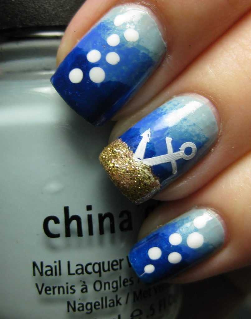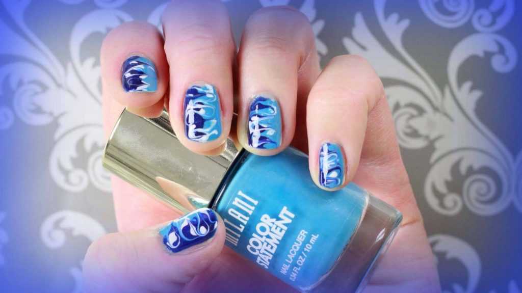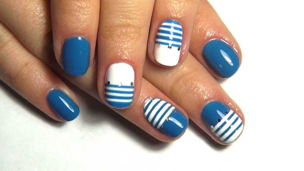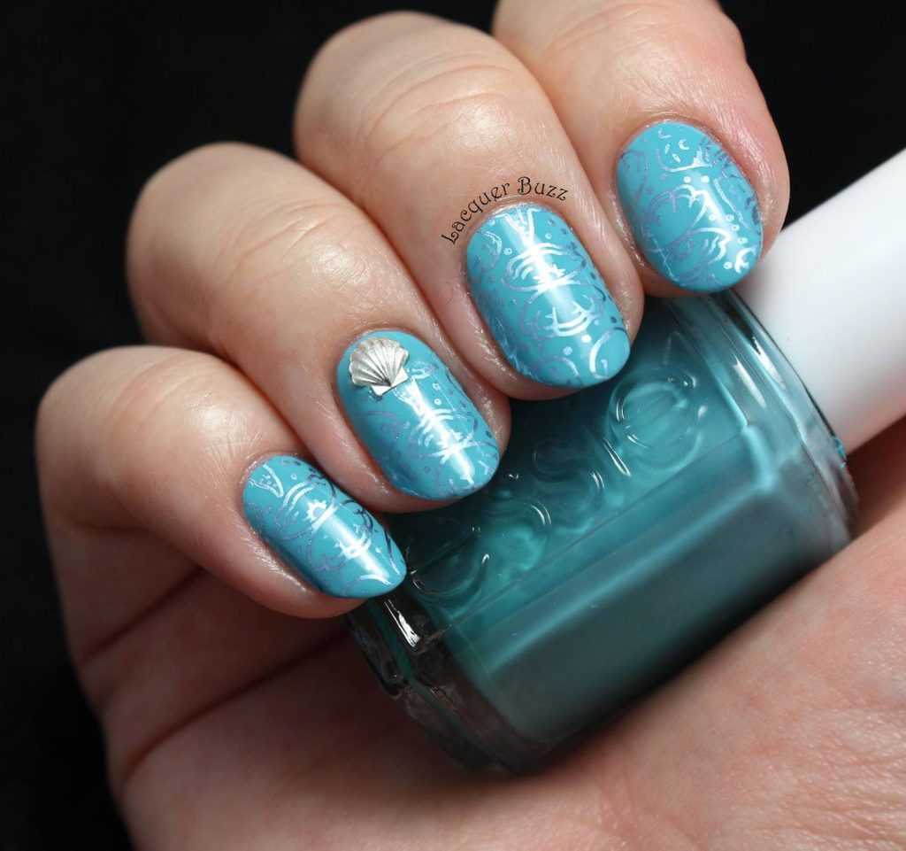 Для сохранения морской тематики необходимо все ногти покрыть данными лаками, а несколько пальцев на руке украсить ранее перечисленными способами