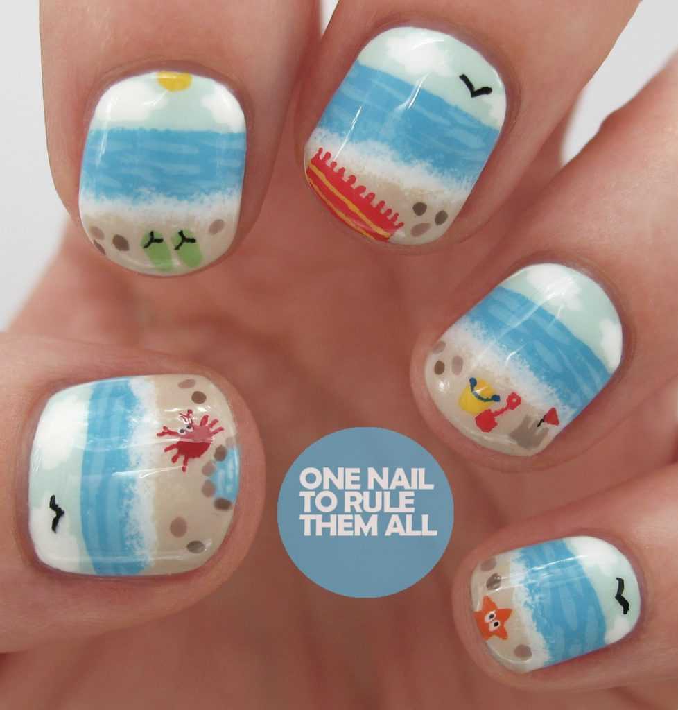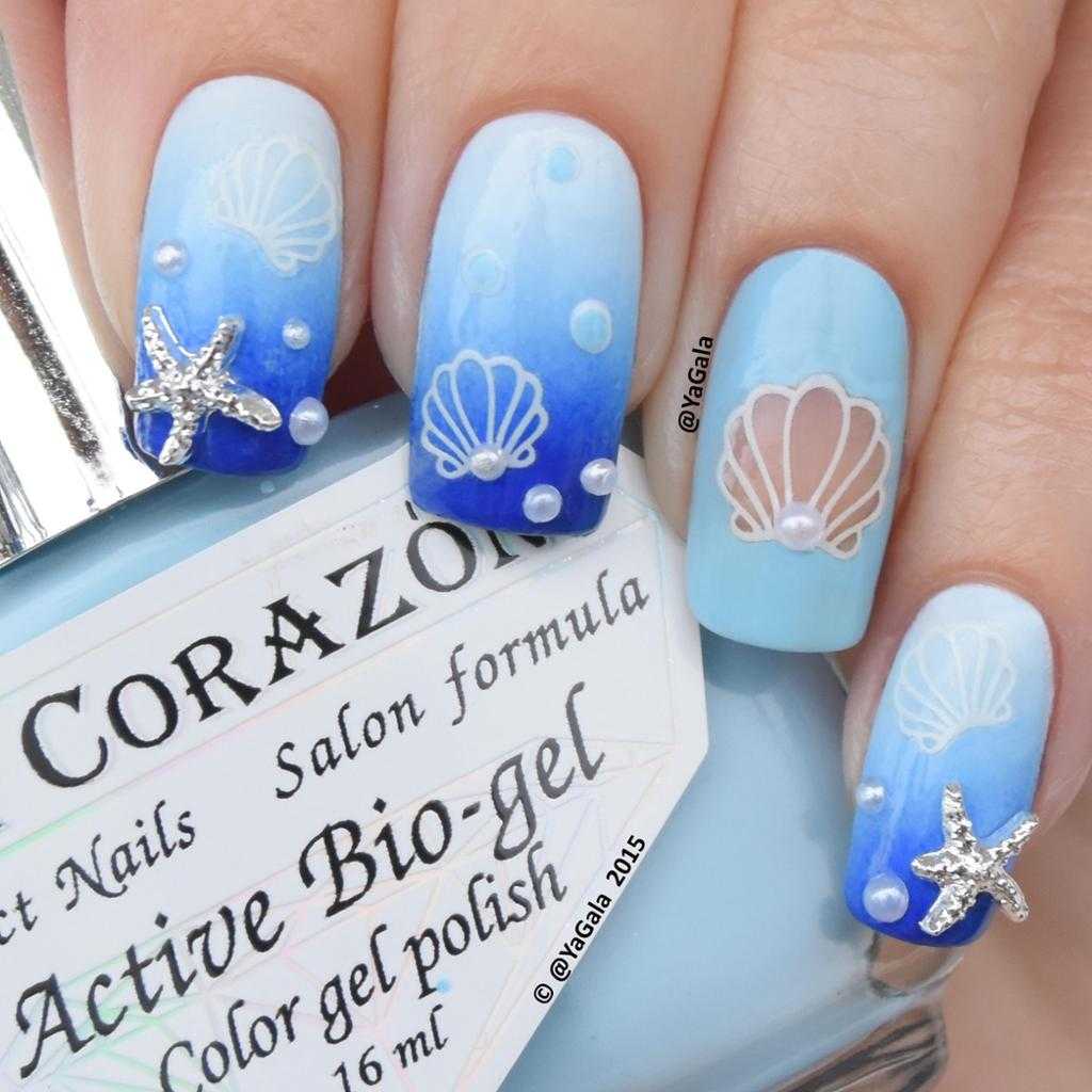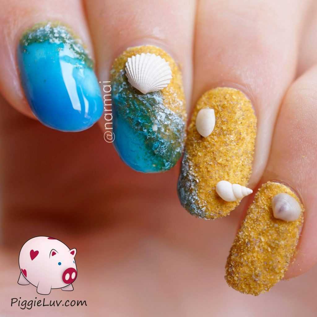 Для поездки на море, пляж, отдых ноготки украшают дизайнами с росписью, картинками, декоративными элементами в морском стиле. Это могут быть ракушки, бабочки, рыбки, морские звезды, имитация капель воды на ногтях. Сейчас актуально рисовать разводы в бело голубых тонах, напоминающие волны с пенкой на пляже. Также очень красиво смотрится натуральный ракушечник в дизайне маникюра. Дополненный акварельной вуалью он загадочно переливается разными оттенками.
