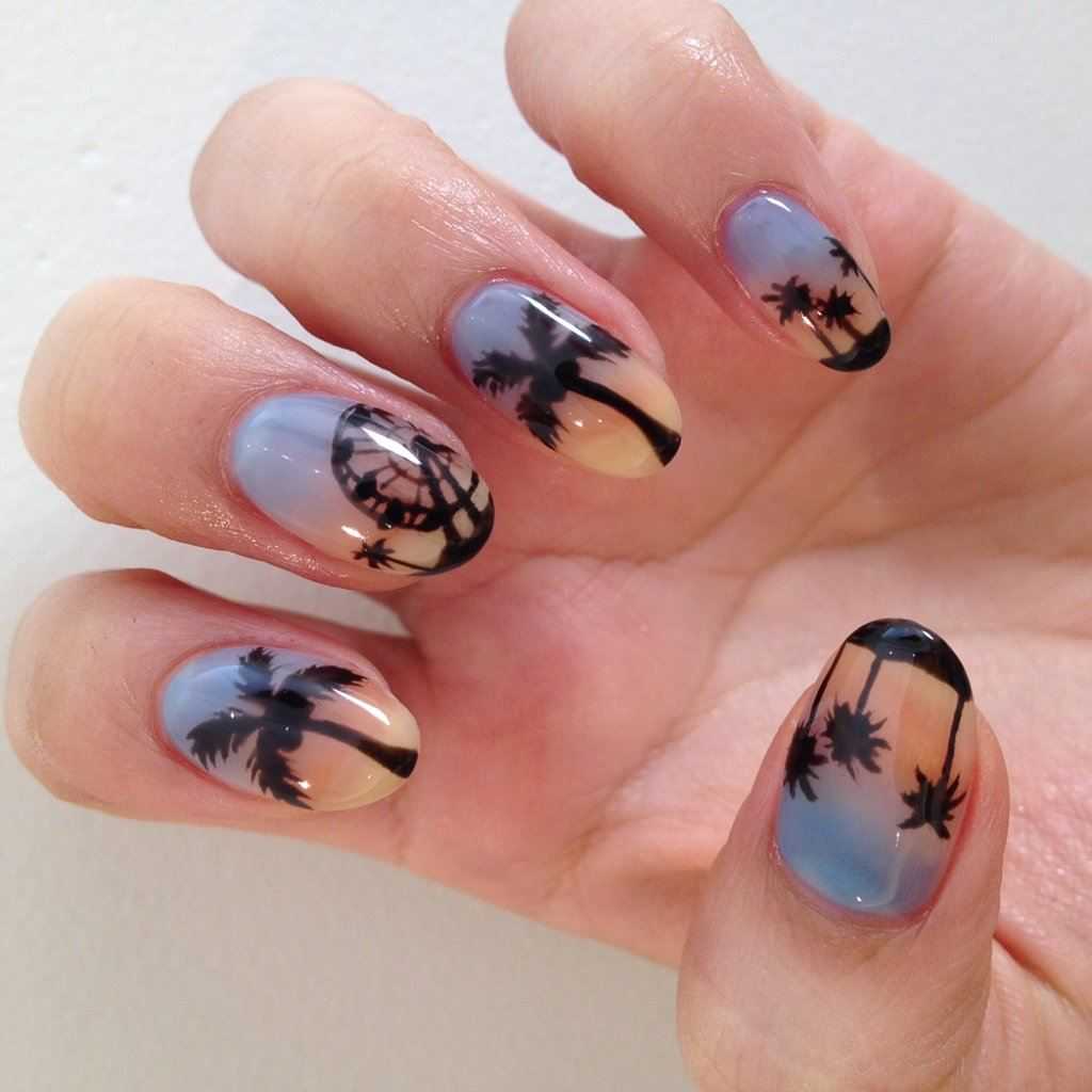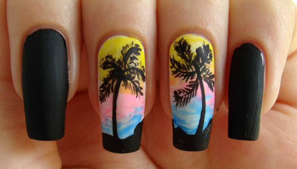 Пальмы — известный символ путешествий к морю — можно нарисовать на ноготках любой длины и формы, цвет фона — тоже любой! Важно лишь прорисовать силуэт дерева или листа лаком контрастного оттенка, чтобы придать росписи выразительность. Очень красиво смотрятся черные пальмы на бирюзовом, лимонном, ярко-розовом, лавандовом или белом фоне (как на фото)