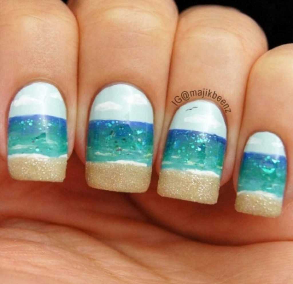 Не стоит забывать и о морском береге. Для этого используйте золотистый шиммер, который будет плавно переходить в бело-голубое покрытие. Таким образом, у вас получится эффект волны, которая накатывает на теплый песок. Как вариант, шиммером можно покрыть только один пальчик, в то время как все остальные выкрасить лаком голубого оттенка.