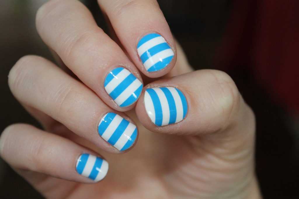 А чтобы линии получились ровными и четкими можно воспользоваться скотчем или стемпингом. Горизонтальными полосками может быть заполнена вся ногтевая пластина или же только ее краешек. Таким образом, вы получите стильный морской френч.