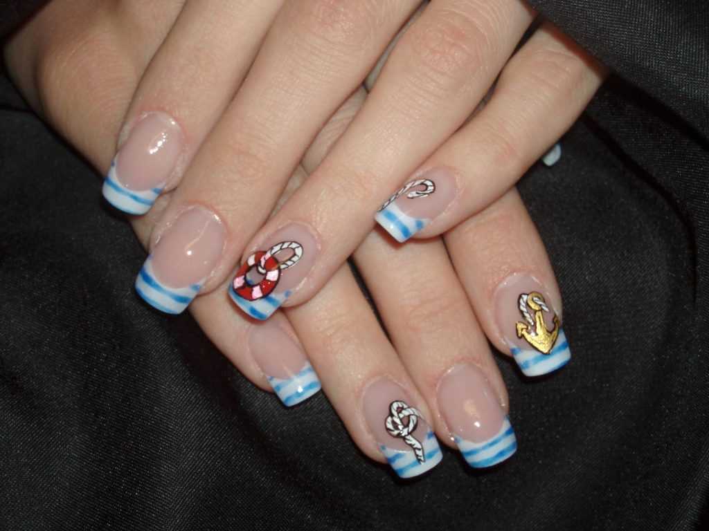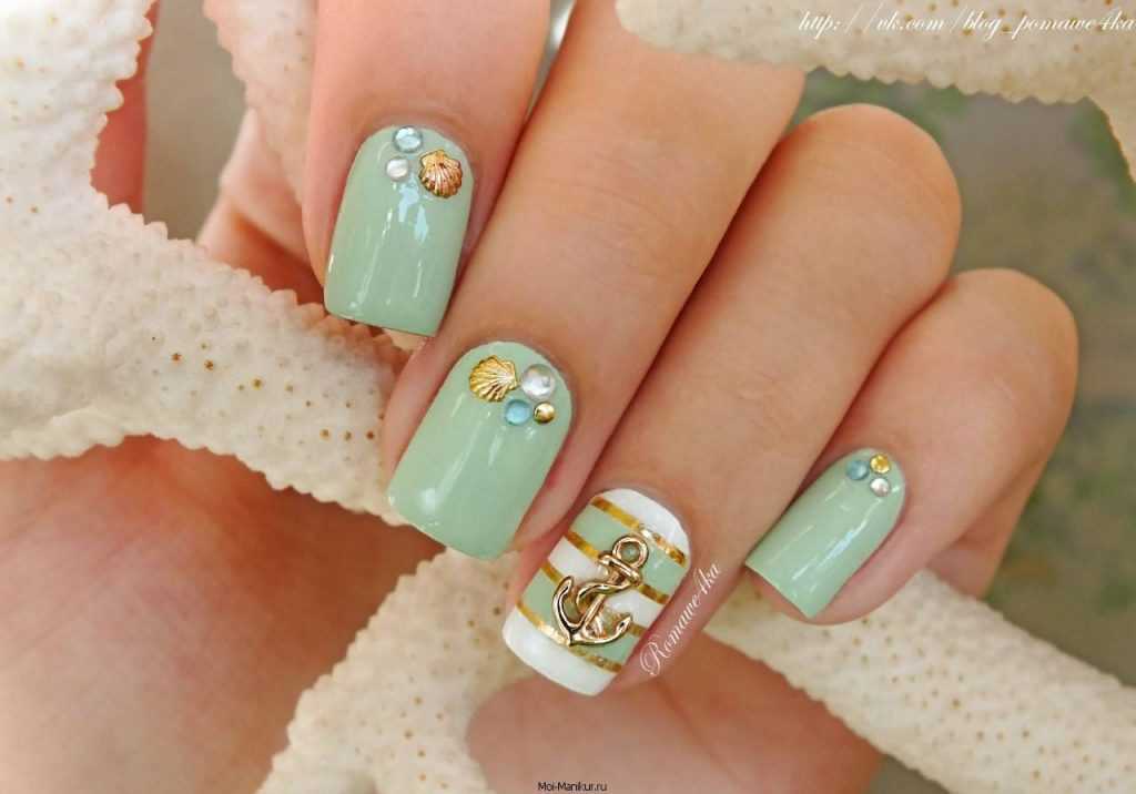 Маникюр на морскую тематику невозможно представить себе без соответствующих рисунков. Эффектно будут выглядеть якоря, пальмы, обитатели морских глубин, ракушки и т. д. Выбор зависит только от вашей фантазии.