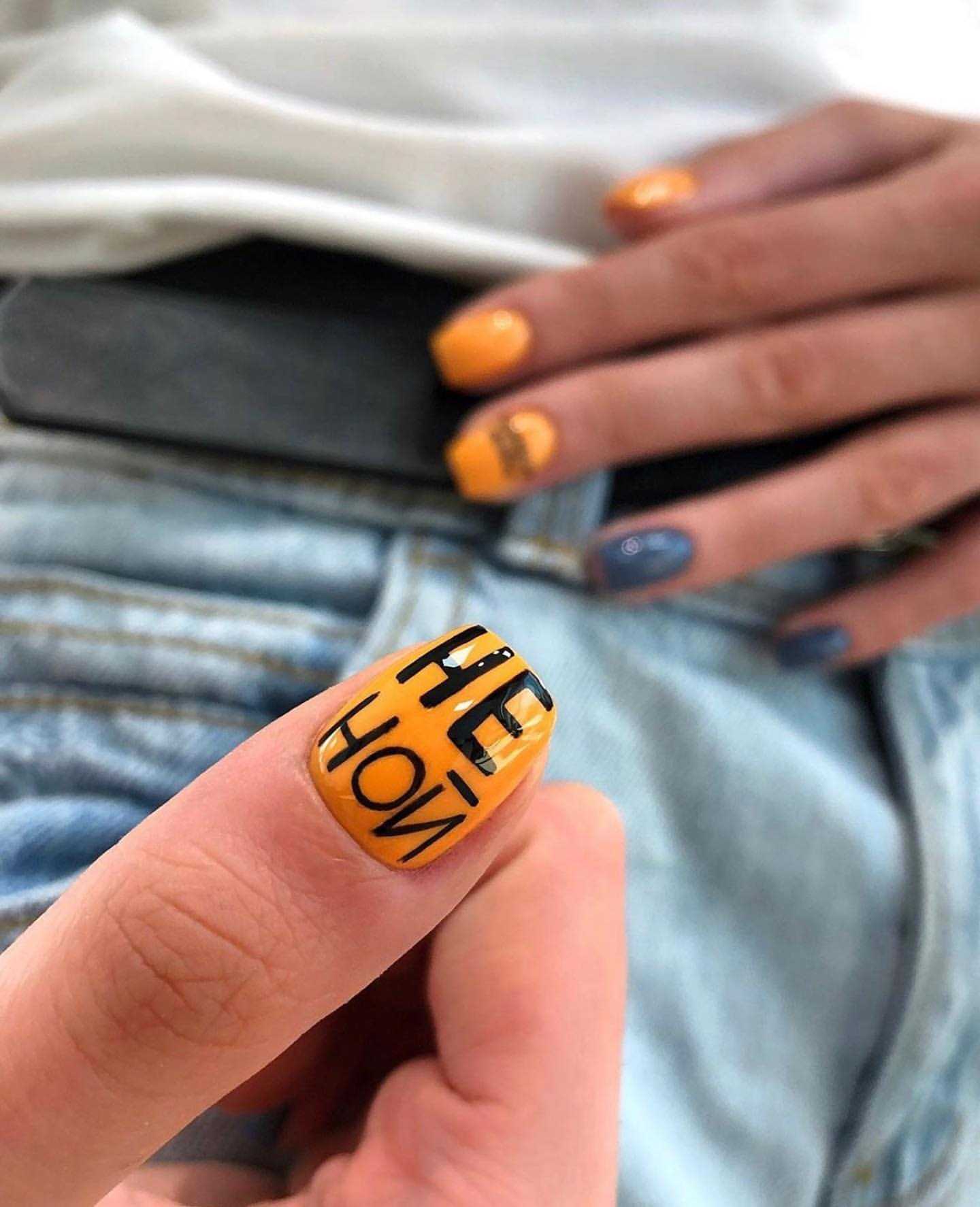 Надписи в маникюре хорошо сочетаются с геометрическими рисунками.