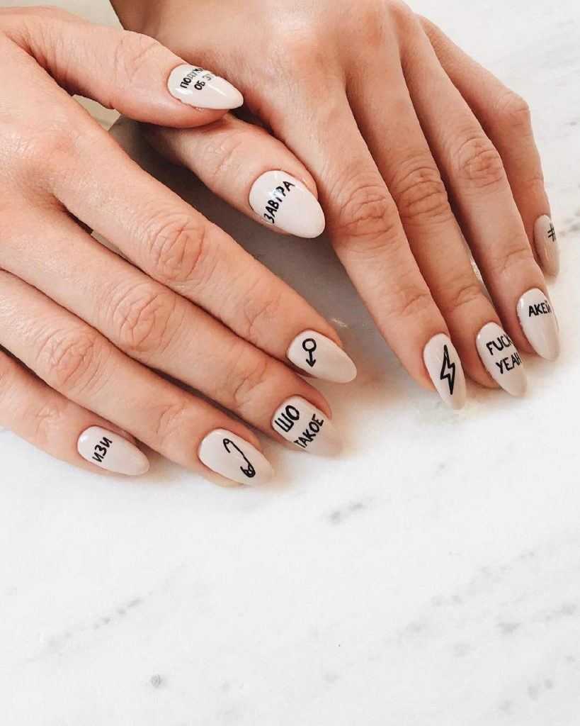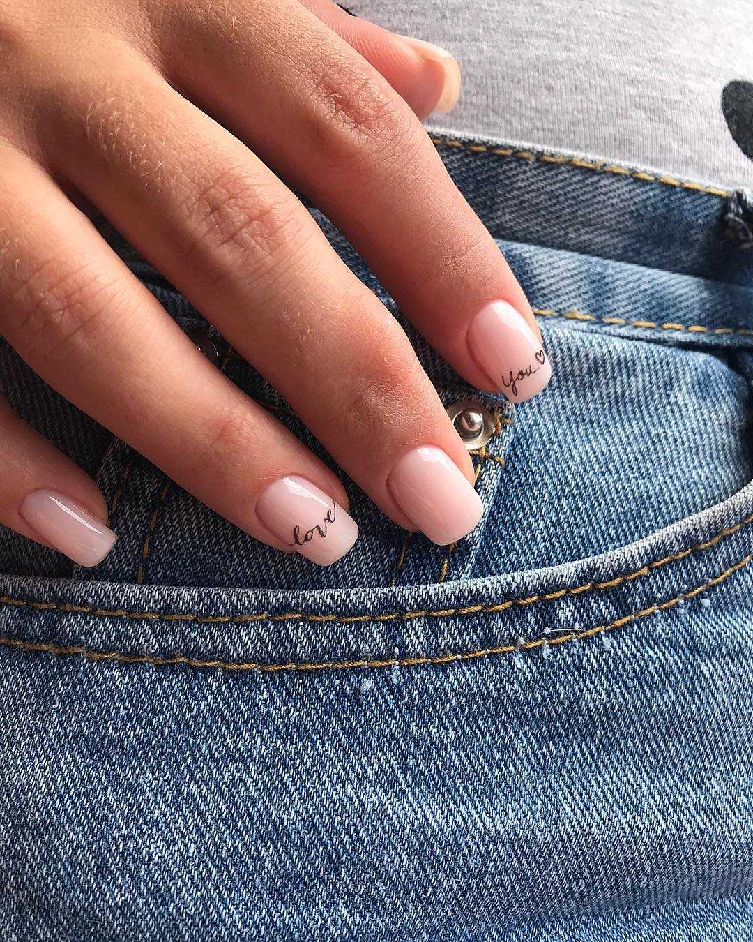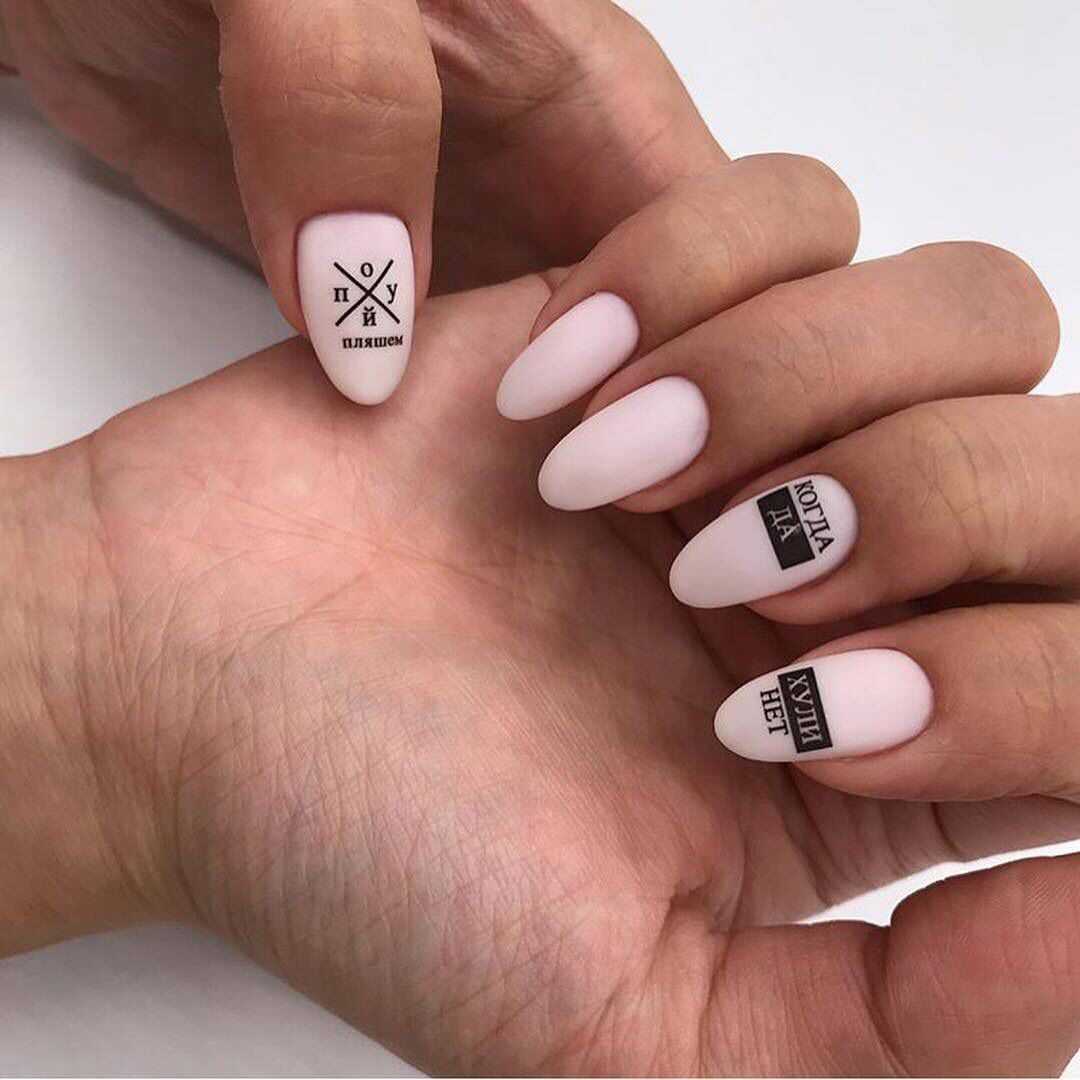 Маникюр с надписями черного цвета хорошо смотрится на матовом покрытии нюдовых оттенков. Такой дизайн можно дополнить мелким рисунком. Этот лаконичный дизайн украсит романтичный лук, повседневный или деловой.