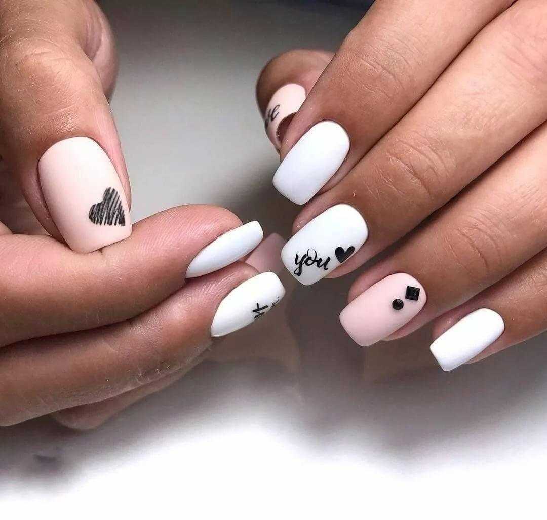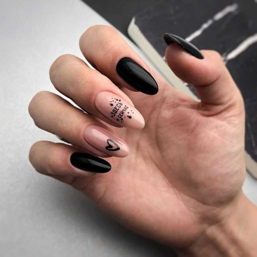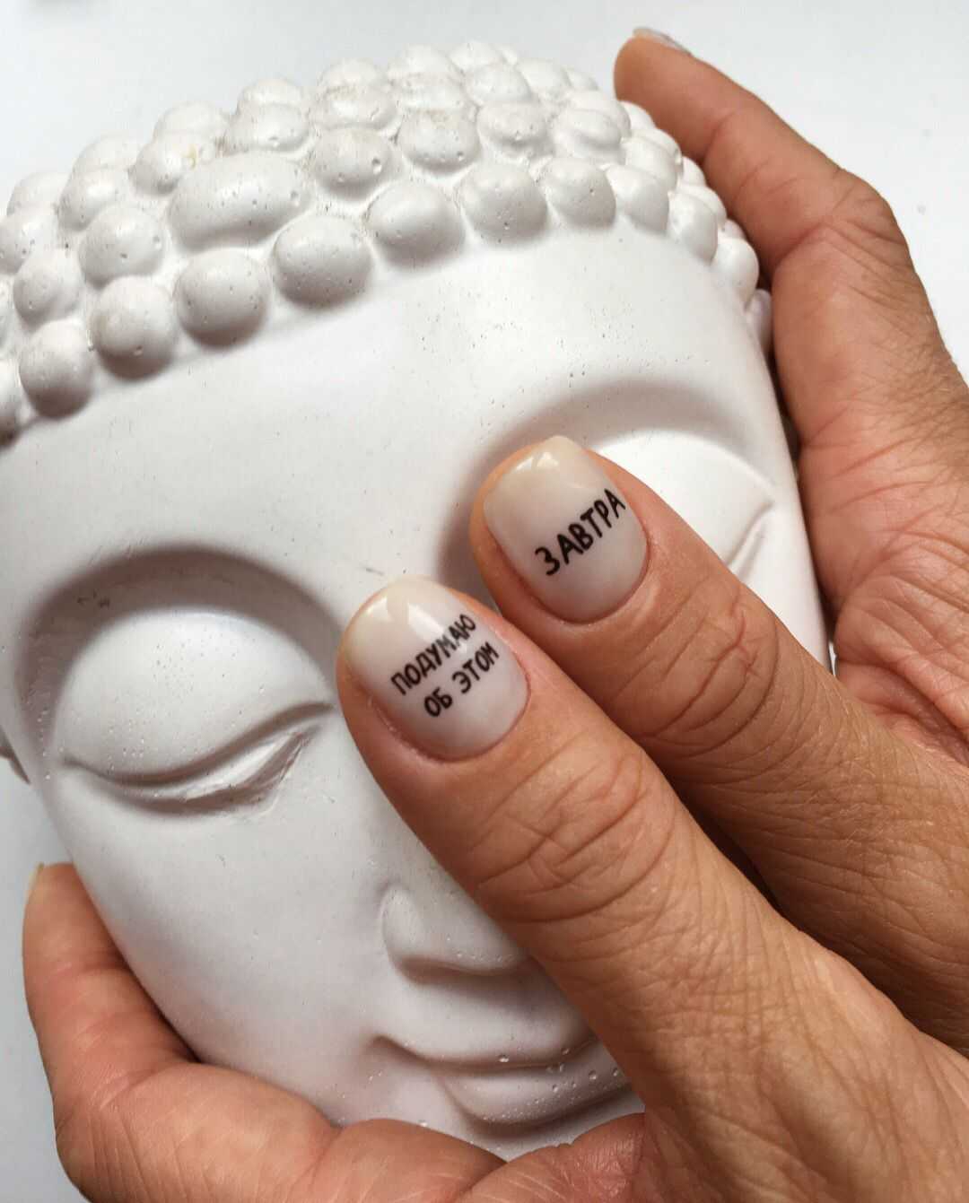 Маникюр с надписями черного цвета хорошо смотрится на матовом покрытии нюдовых оттенков. Такой дизайн можно дополнить мелким рисунком. Этот лаконичный дизайн украсит романтичный лук, повседневный или деловой.