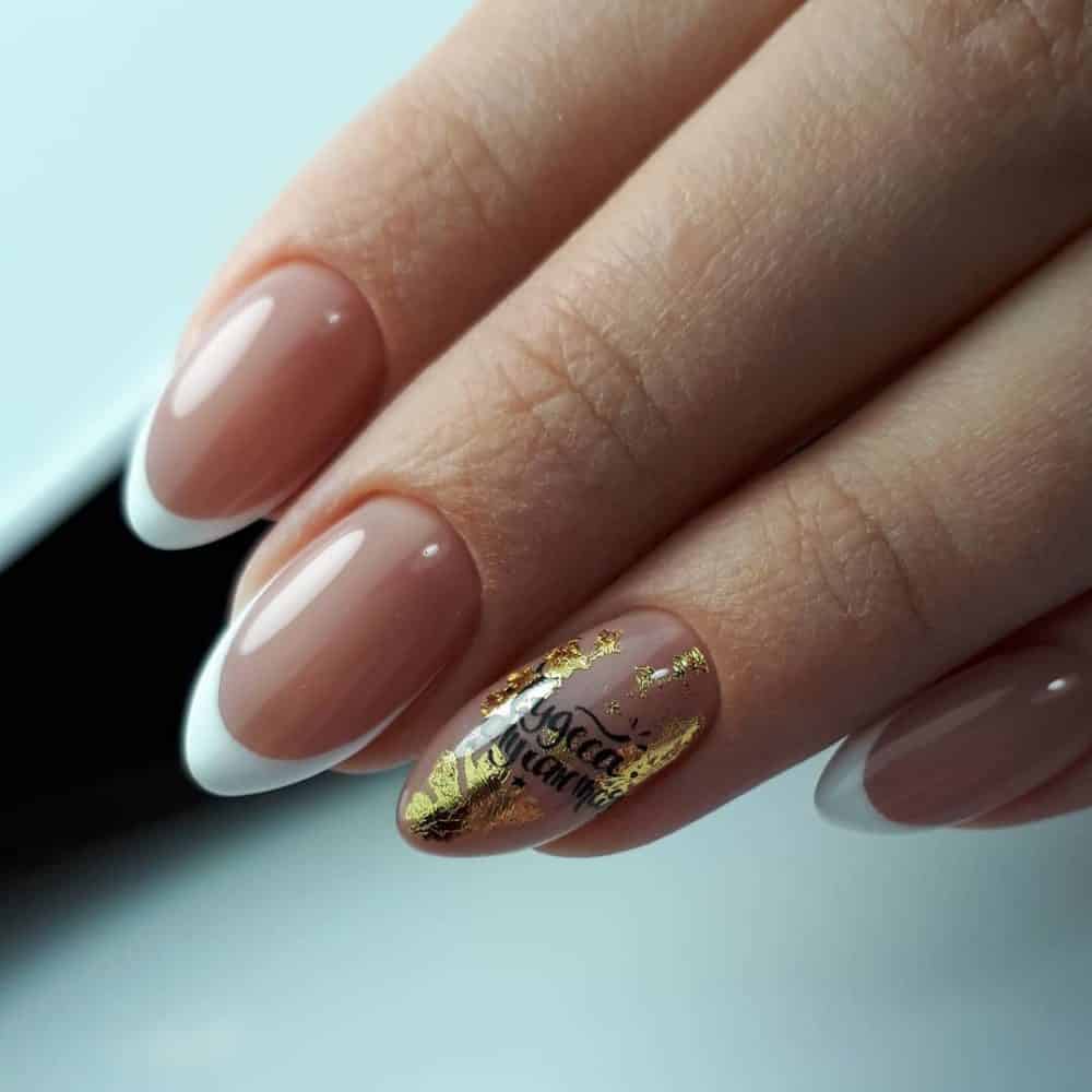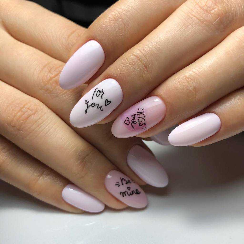 Красота и нежность такого нейл-арта не останутся незамеченными. Для воссоздания надписи потребуется тонкая кисть и слайдер. Наиболее выигрышно смотрятся сочетания со спокойными нежными базовыми тонами лака.