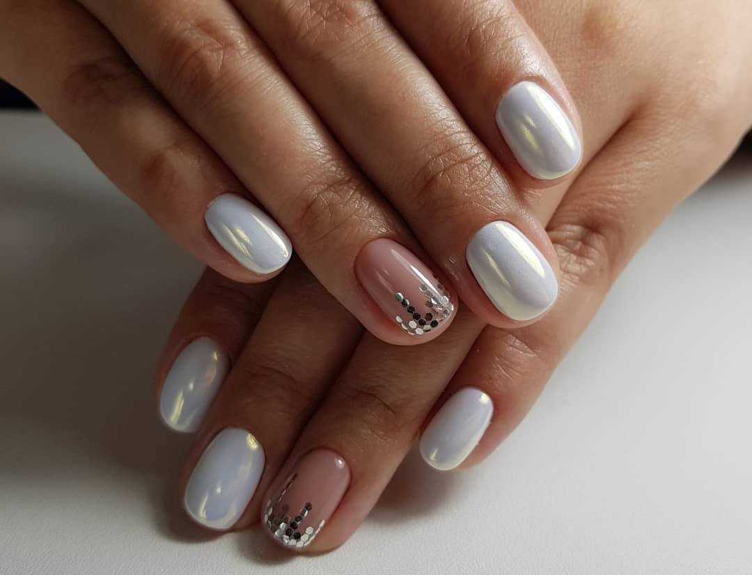 Серебренный. Этот оттенок считается универсальным для любой длины ноготков. Чаще всего его используют именно для декора. Мы же дополнительно рекомендуем присмотреться и к зеркальной втирке с серебром.