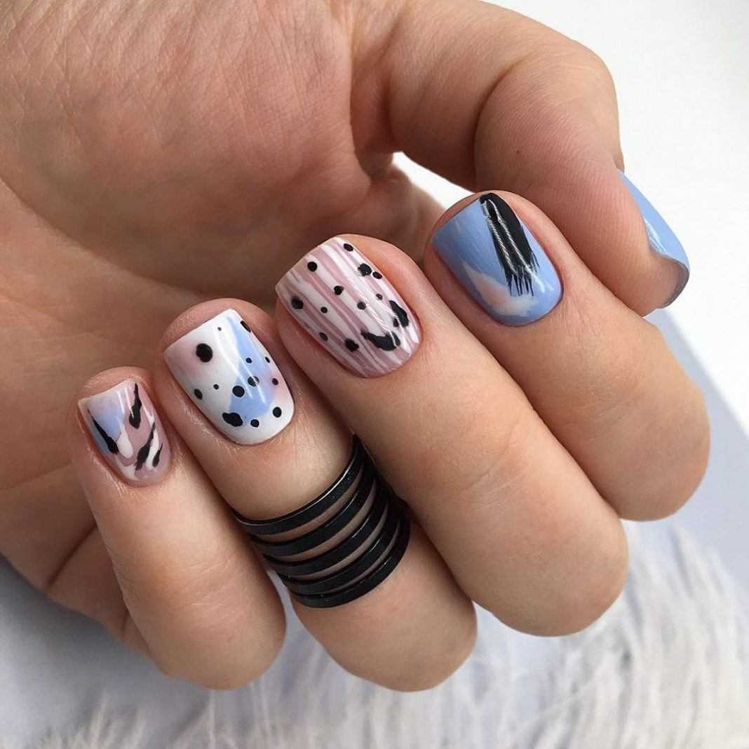 - Абстрактный маникюр. Имея в своем стиле самые различные элементы, такие как разводы или же брызги краски, графическая роспись, а также градиент, помогли этому интересному дизайну стать одним из самых популярных и достаточно востребованных среди клиенток.