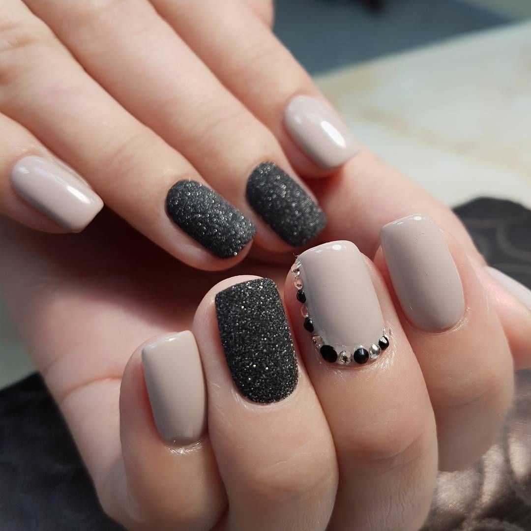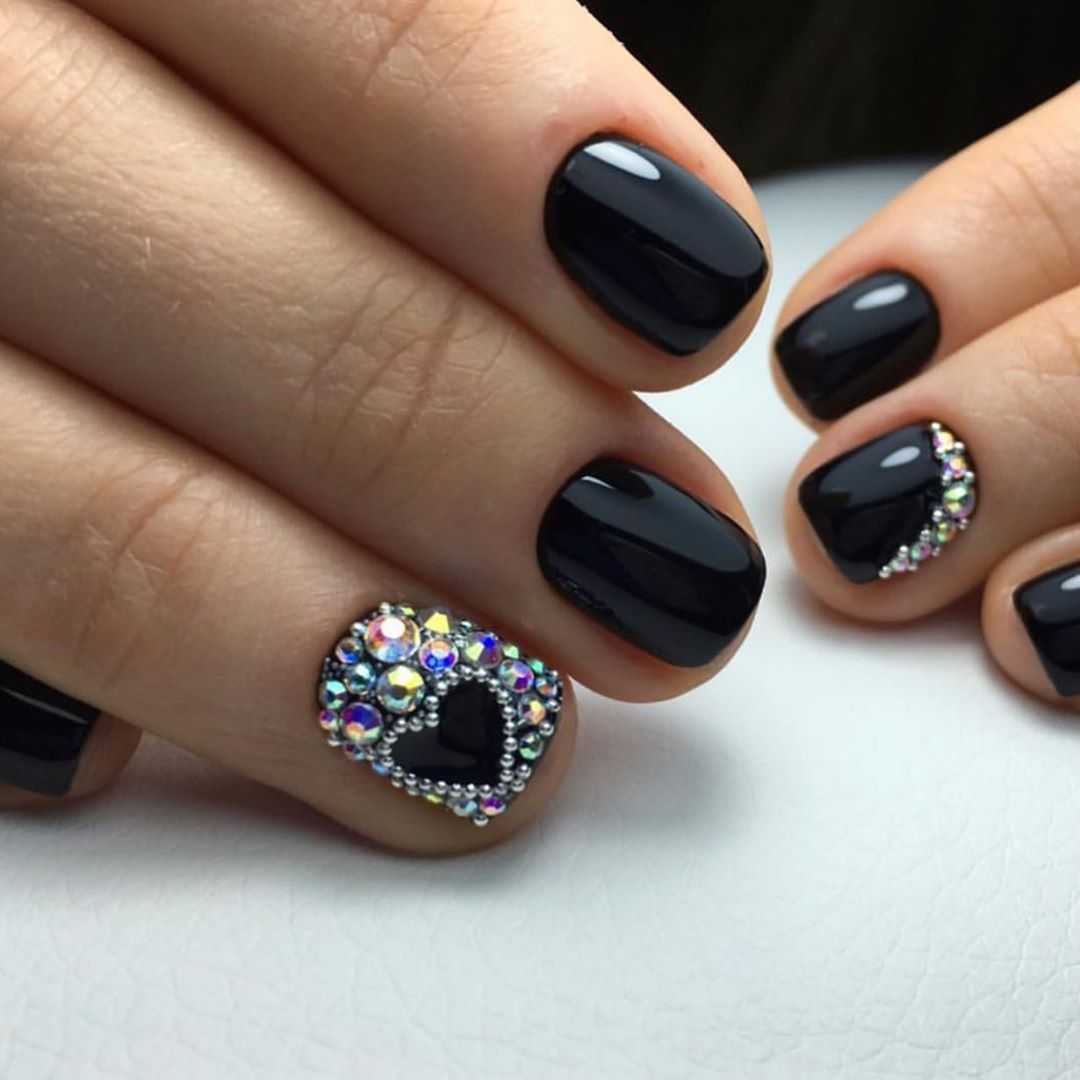 - Маникюр со стразами. Стразы на ноготках смотрятся очень красиво и элегантно, особенно на темной основе, что вместе делает их еще более милыми.