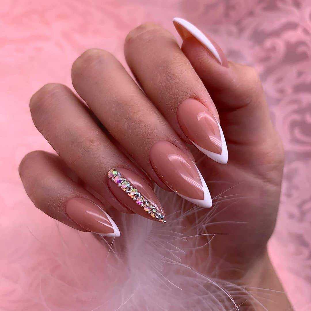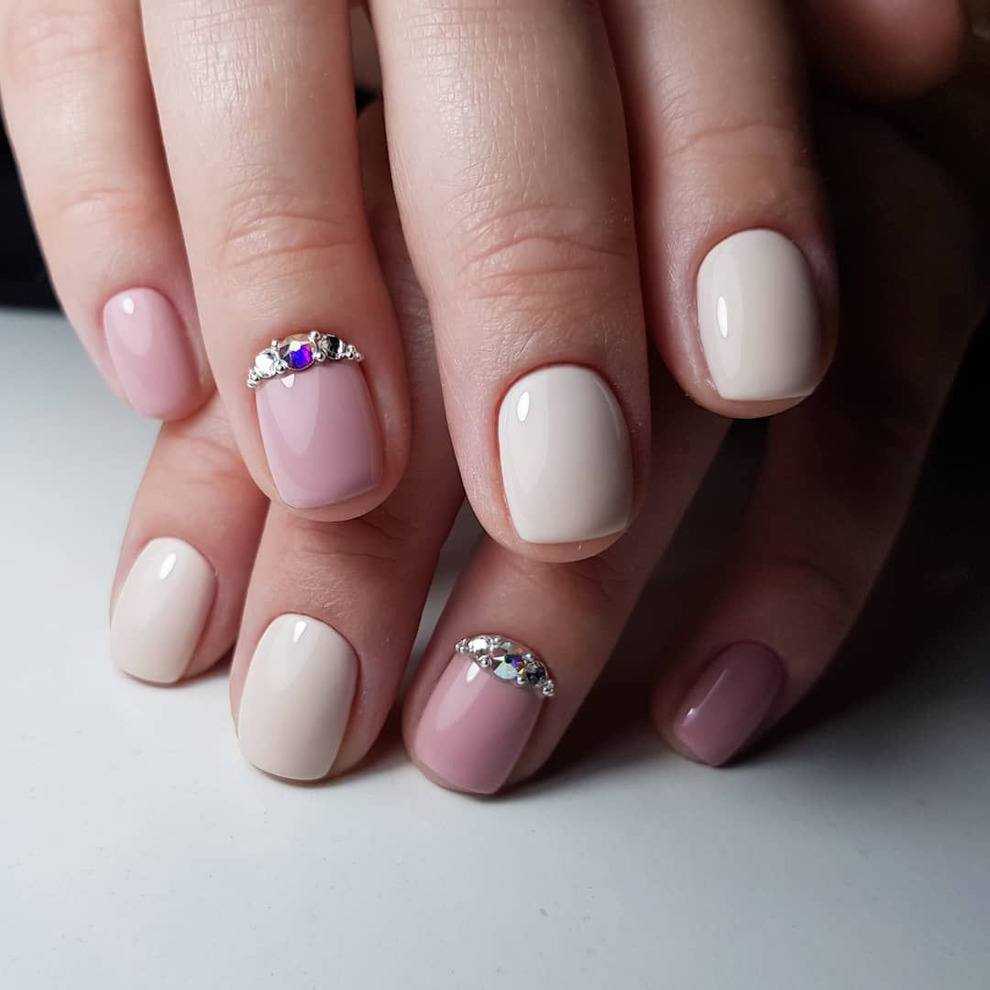 Тандем из небольших камней и сверкания страз на ногтях освежит любое естественное покрытие. Главное избегать чрезмерного блеска, который достигает продуманным размещением блестяшек.