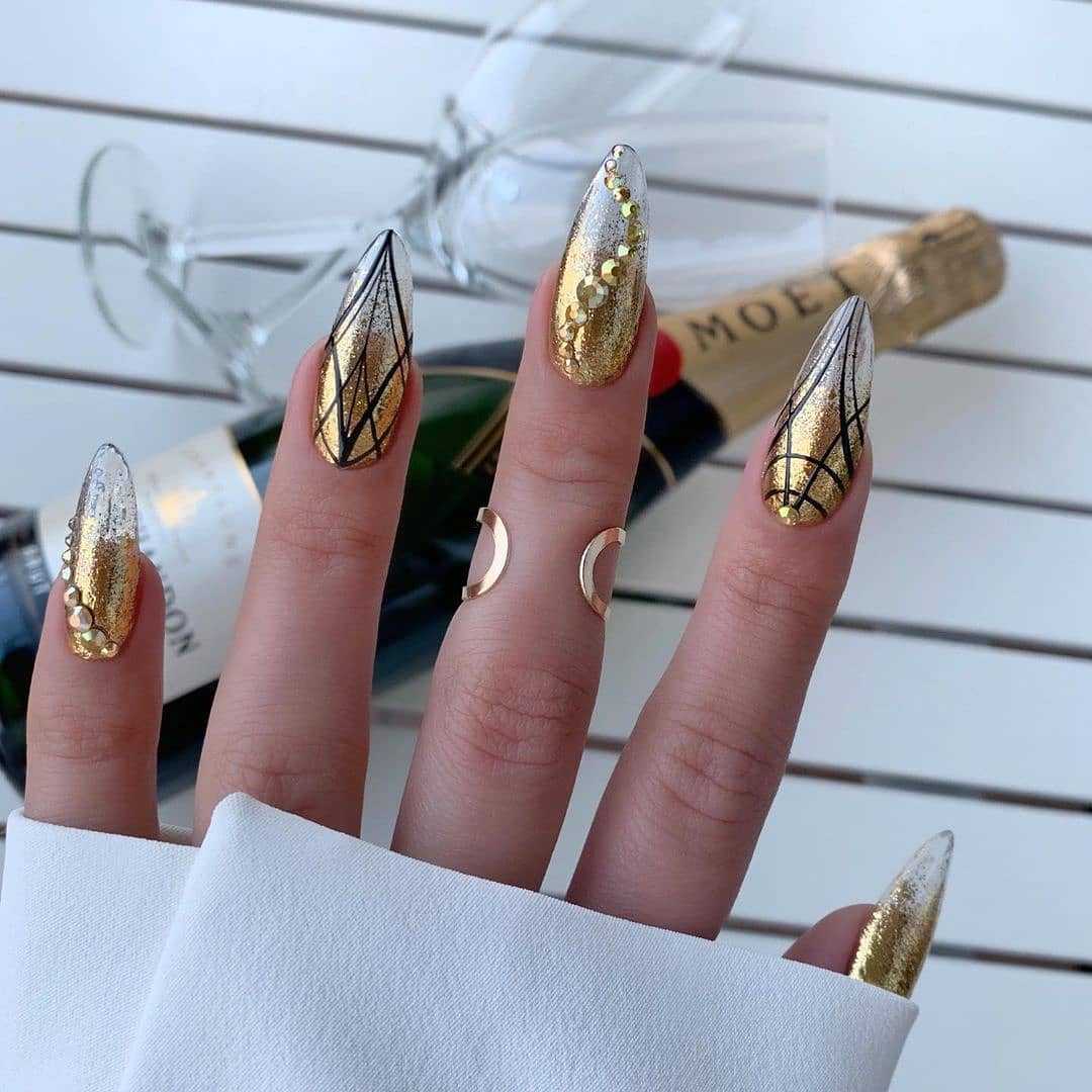 Поскольку сейчас очень модный геометрический маникюр, почему бы не добавить к нему золотых полосок, тем самым сделать ногти еще шикарнее и красивее.
