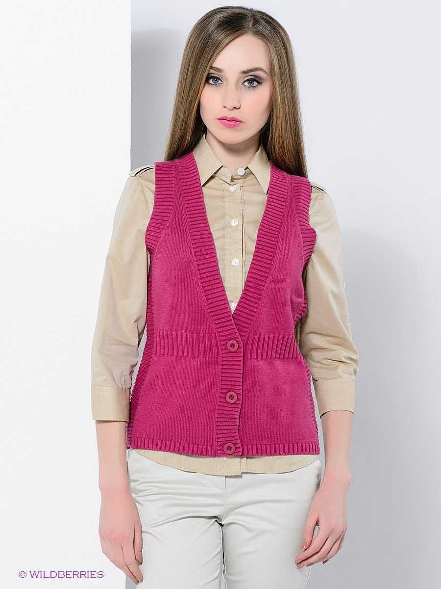 - Модели из трикотажа. Встречается большое разнообразие трикотажных женских жилетов, имеющих различные принты. Их допустимо носить поверх рубашек, футболок, совпадающих по тону с основным рисунком. Такую модель допустимо надевать поверх голого тела. Подходит к джинсам, брюкам, юбкам.