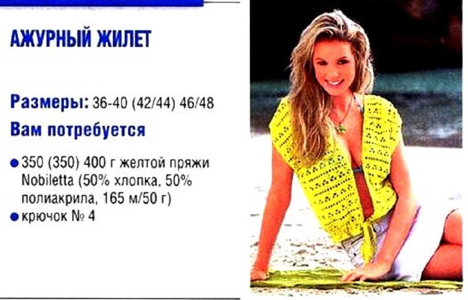Для вязания потребуется 400 г пряжи (хлопок с акрилом), крючок № 4. Необходимая плотность вязки: 12 рядов по 20 петель на квадрат 10 X 10 см. Процесс изготовления жилета простой: