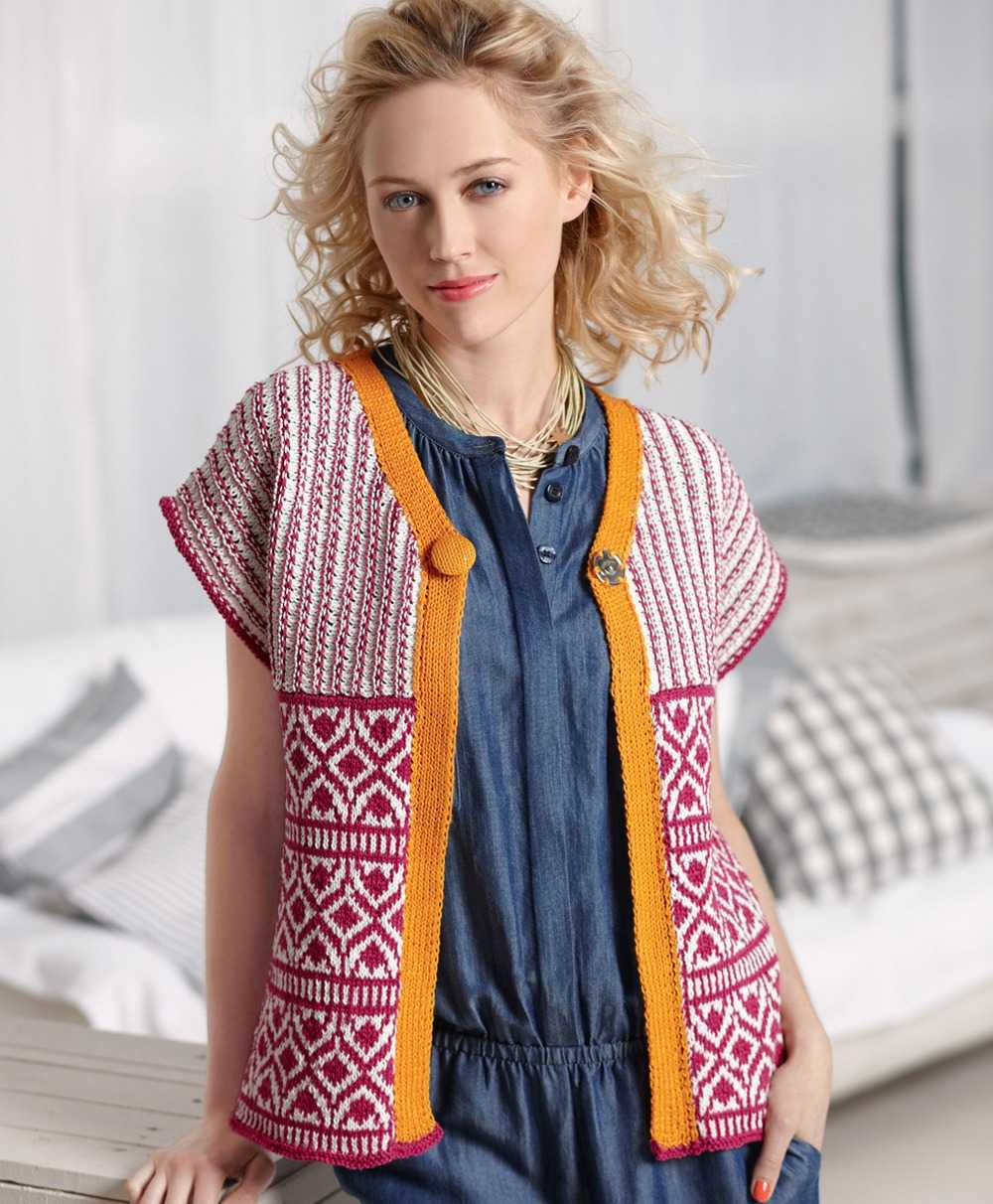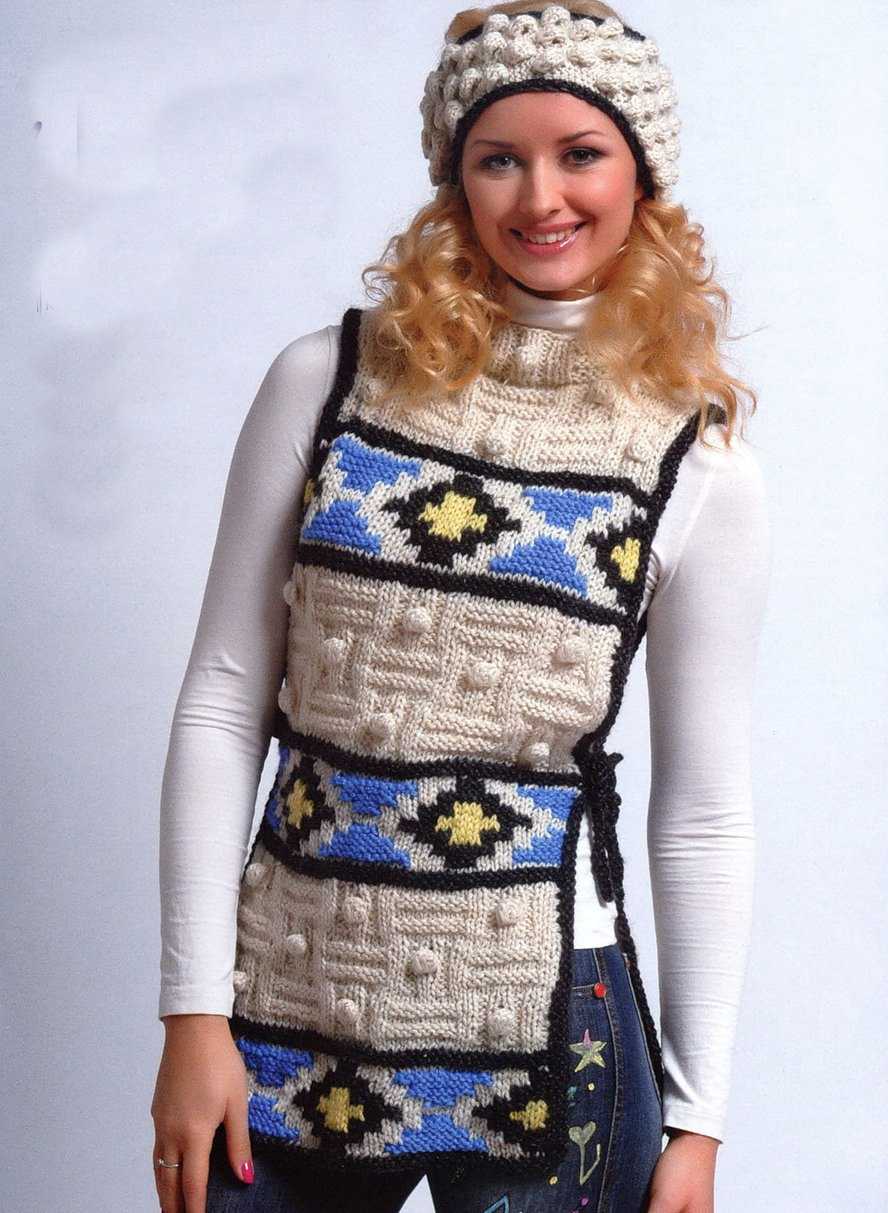 Вязаные жилетки часто передают этнические направления с использованием определённых техник вязания.