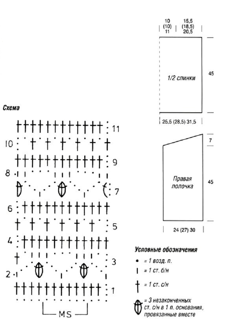 Набираем с помощью крючка цепочку из 74 в. п., вяжем 11 рр. по сх. 1 (четные рр. – лицевые рельефные столбики, нечетные – изнаночные). Далее вяжем с. без н. с убавками для приталивания согласно выкройки.