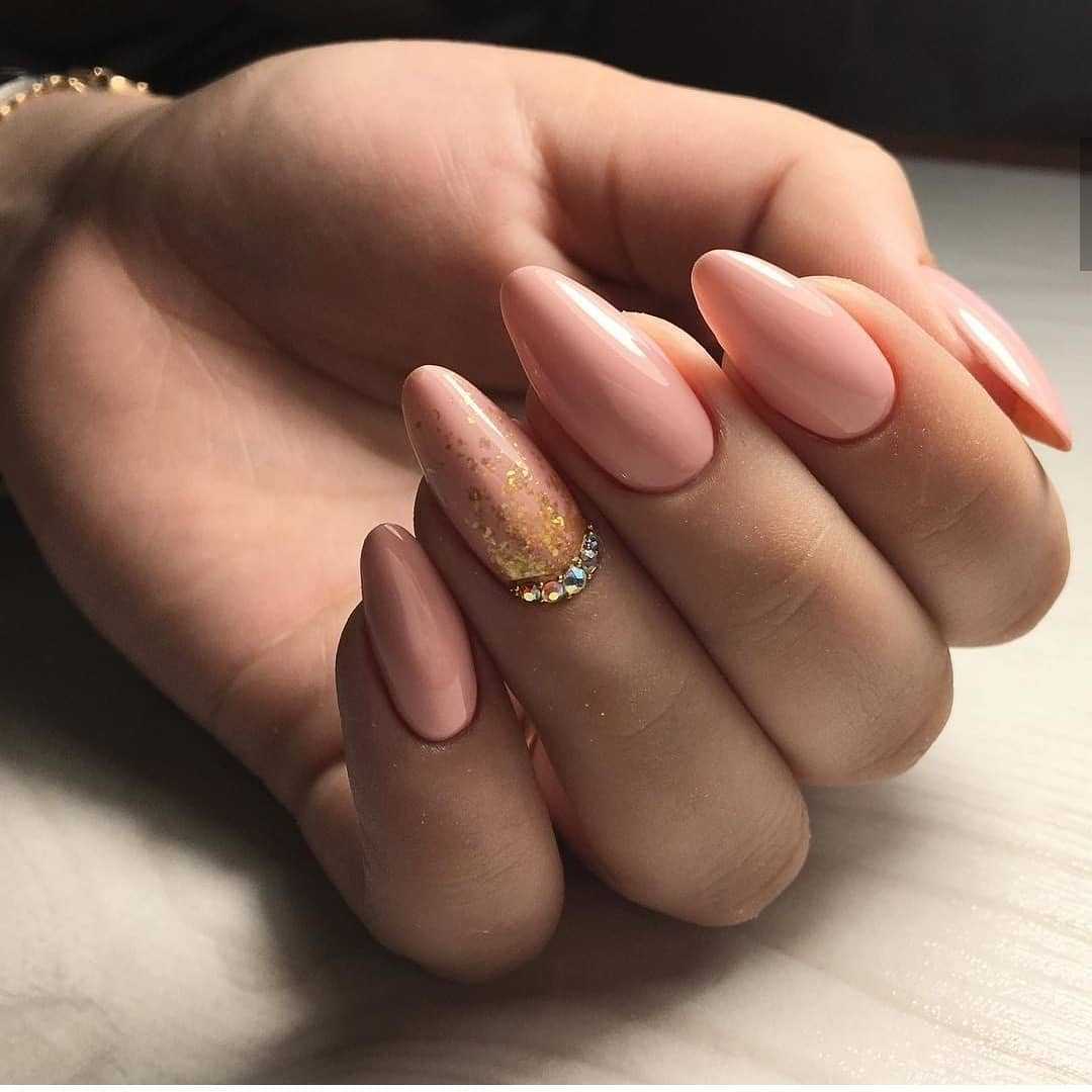 Нюдовым маникюром на длинные ногти называется дизайн телесного цвета, максимально спокойный и естественный. Он красиво смотрится на ногтях миндальной формы, подходит для делового, романтического, свадебного образа. В качестве дополнения дизайна лучше выбирать бледные матовые вставки или прозрачные хрустальные стразы.