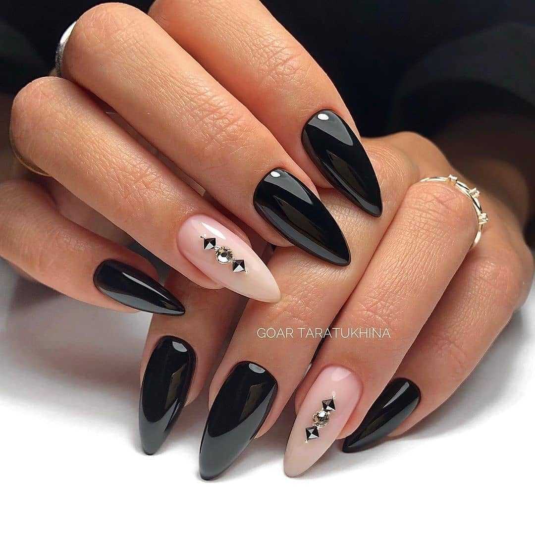 Стильно и эффектно будут смотреться длинные миндалевидные ноготки черного цвета, украшенные серебристыми блестками.