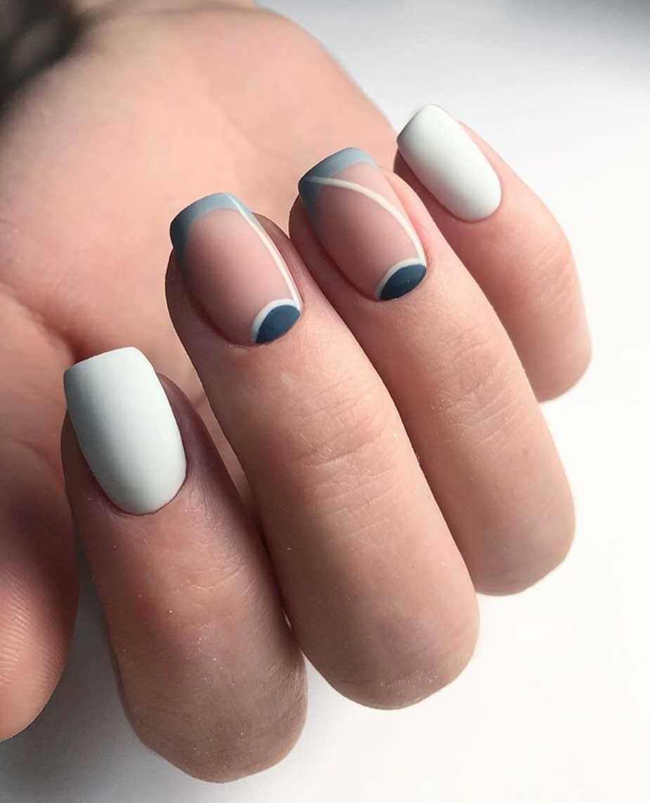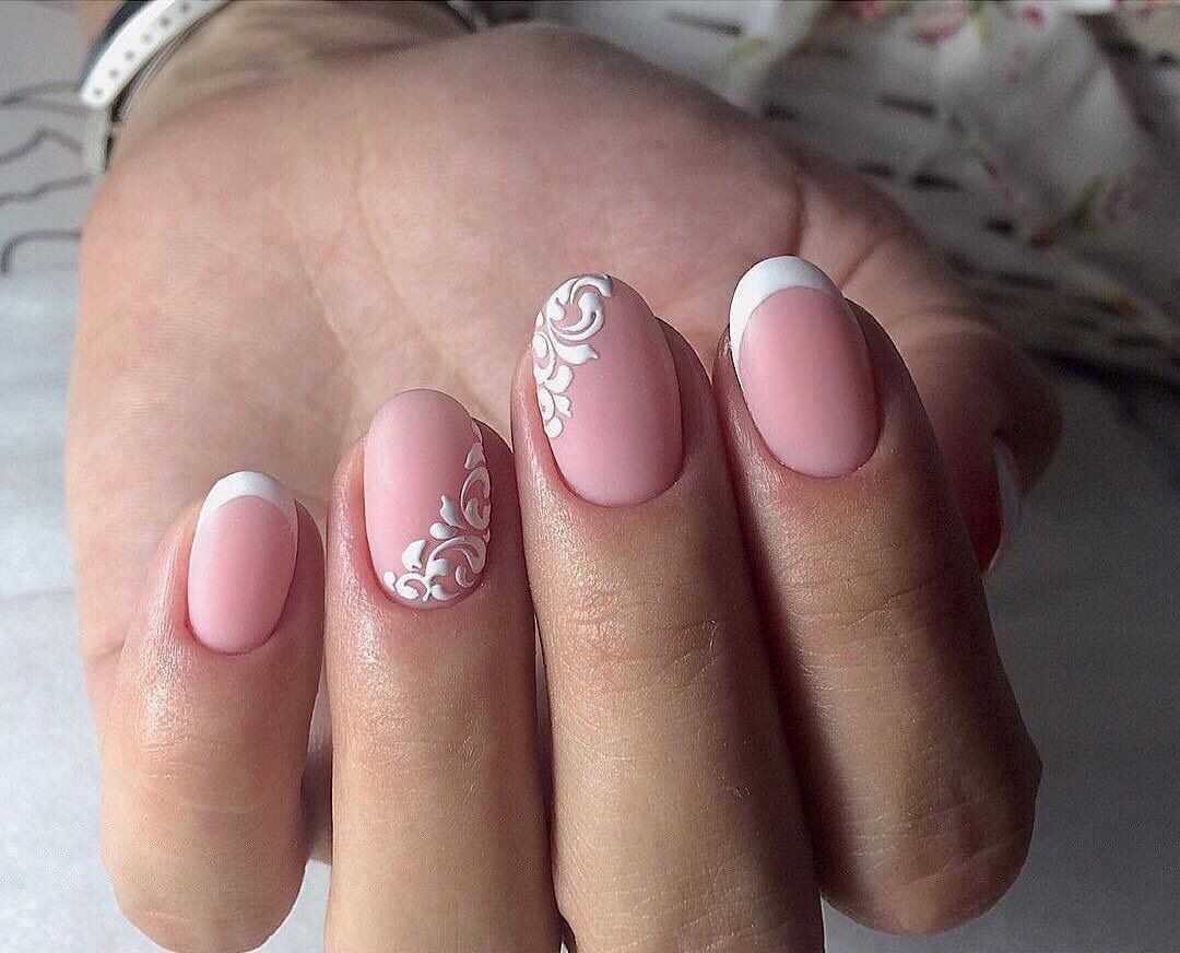 нюд с матовым белым. Идеальный вариант для коротких ногтей. Если нет времени или фантазии, то просто можно накрасить один ноготь на руке матовым белым. Он создаст приятный контраст, но вместе с тем все будет смотреться непринужденно.