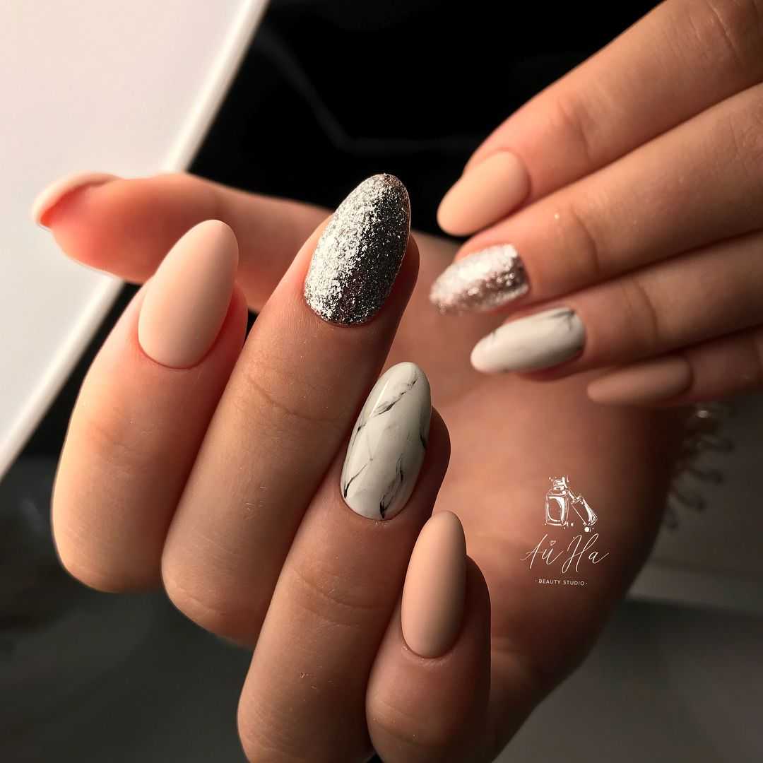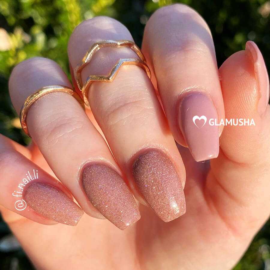Хорошо использовать с нюдом и глиттер, но при этом важно выбирать нежные и сдержанные оттенки. Вы можете также как и с белым нюдом накрасить всего лишь один ноготь, а можно добавить немного глиттера сверху нюда
