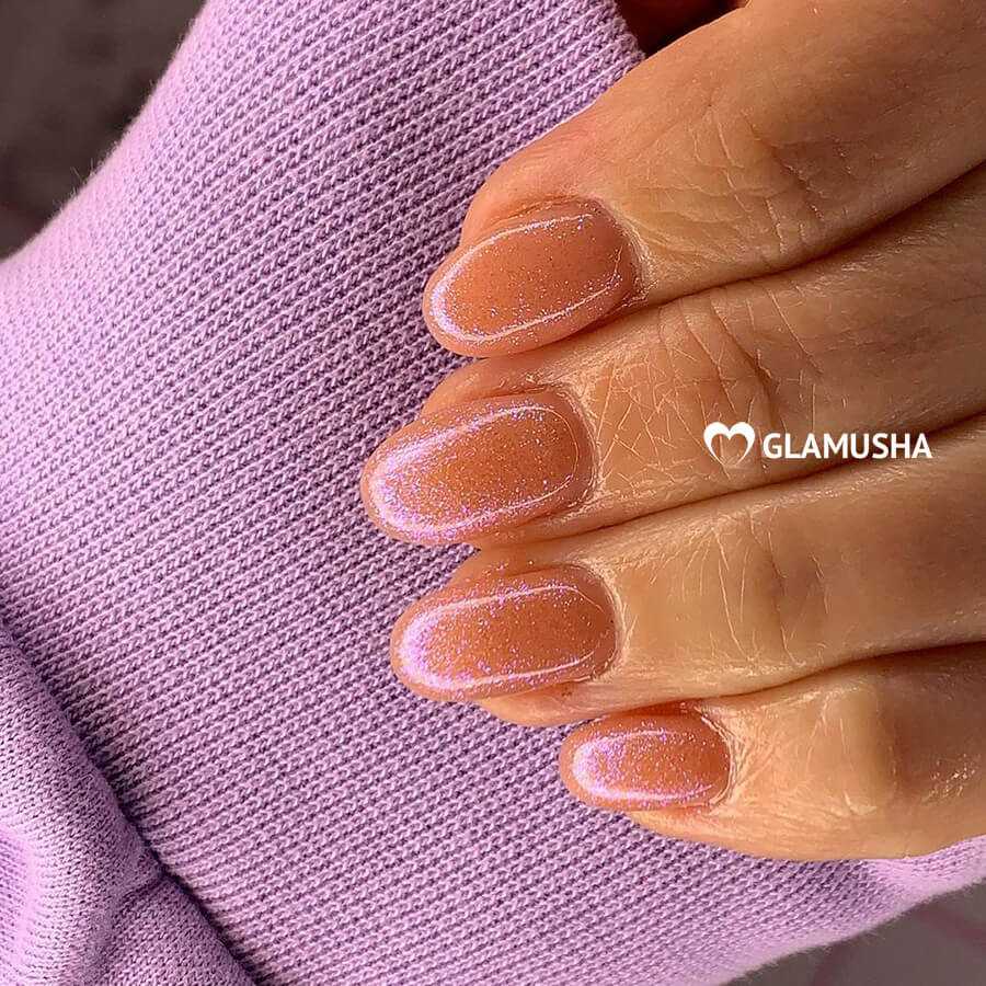 Короткая длина ногтей способна красиво сочетаться не только с многими оттенками покрытий, но и различным декором, например, блёстками. К тому же многие мастера маникюра настоятельно рекомендуют использовать именно эти виды дополнений, поскольку их главной особенностью является отсутствие объёма, что позволит избежать утяжеления дизайна и прекрасно освежит оформление. Нюдовый маникюр с блёстками – это выделение глиттером лунулы у основания и сверкающий френч, оттиски фольги и оригинальные узоры из камифубуки. Также очень красиво смотрится блестящая растяжка на паре акцентных пластин и полное выделение декоративными элементами одного из пальчиков.