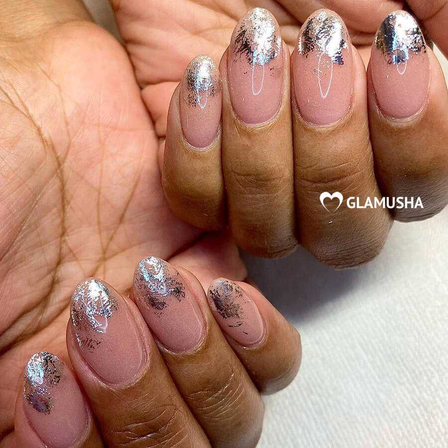 Одним из самых популярных вариантов для этого миндалевидного дизайна маникюра будет фольга. Он придает ногтям мягкий и красивый металлический эффект, который идеально подходит для вечерних образов.